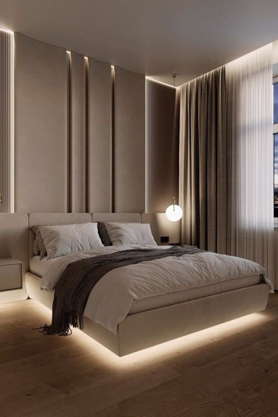 Подсветка периметра в таком случае незаменима. Она очертит геометрию комнаты и создаст акценты в обстановке.