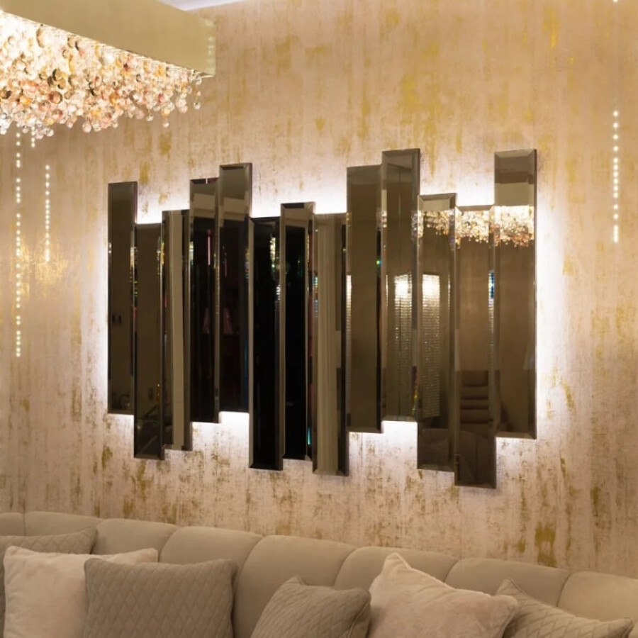 С помощью лучей от источника можно создать подсветку стены в виде эффектного орнамента. В зависимости от ширины луча восприятие разнится. Широкий угол рассеивания, например, может стать масштабной подсветкой ниши и объектов в ней. Узкие лучи в продуманной расстановке создают декоративные орнаменты.