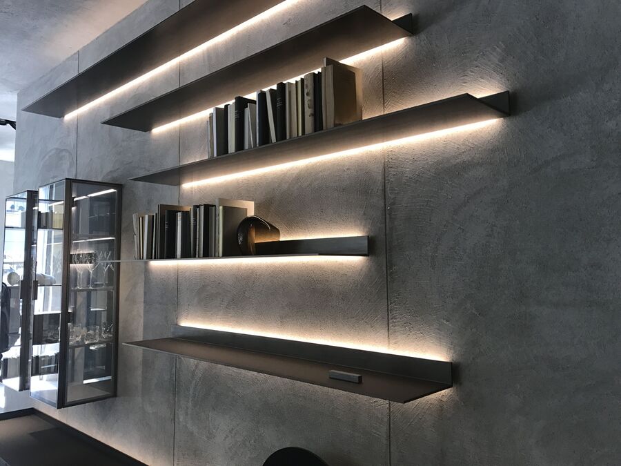 Их располагают таким образом над полкой, чтобы они освещали всё, что находится на ней.