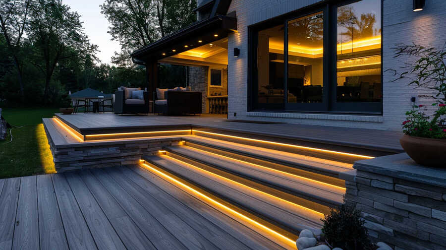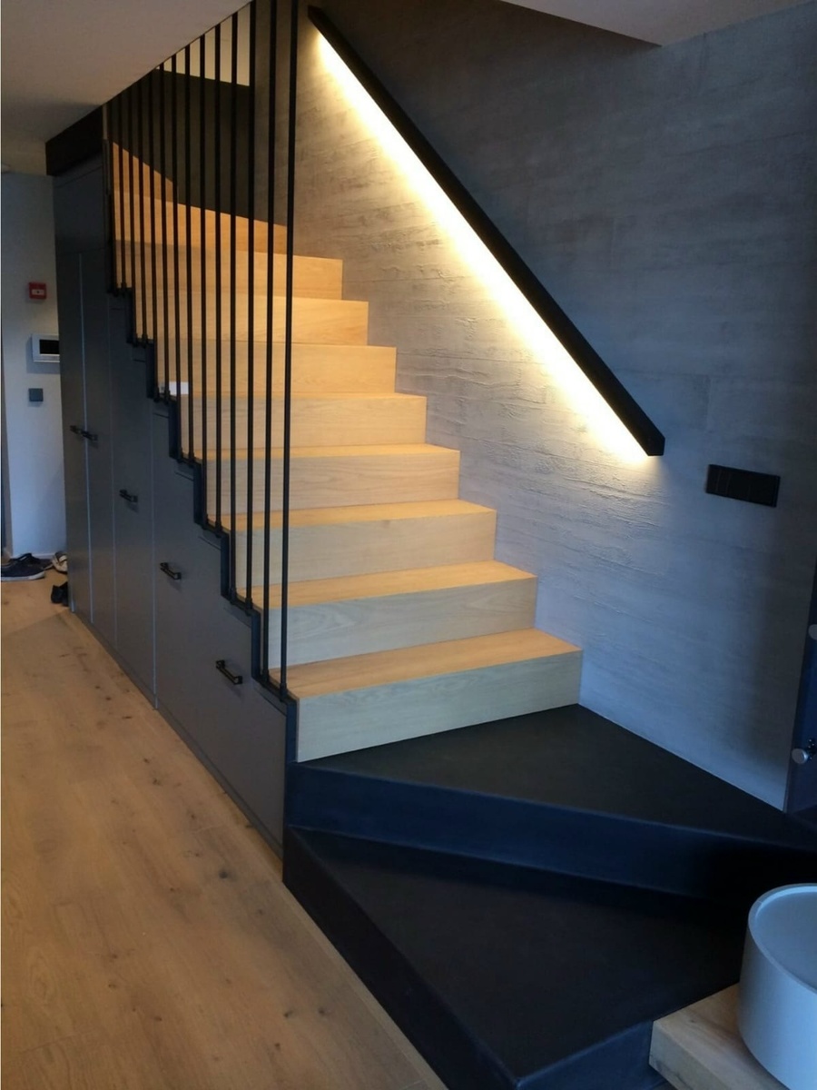 На лестницах уместно расположить источники возле ступеней или под перилами. Таким образом, вы осветите всю конструкцию, что облегчает ориентацию на ней.
