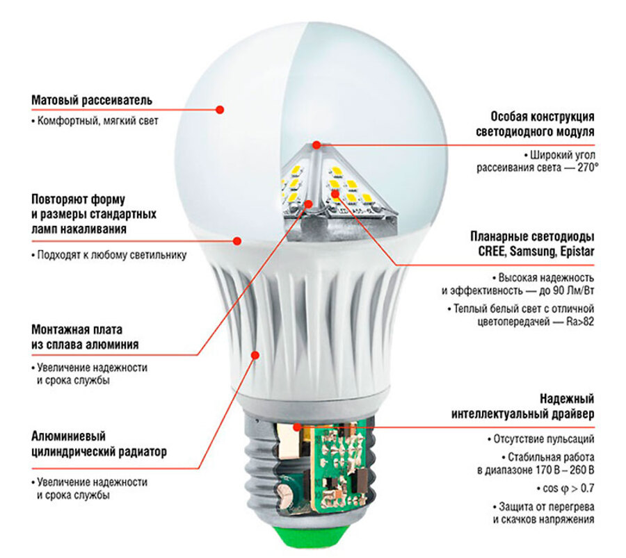 Колба и цоколь — стандартные составные элементы источника света. В смарт-лампочке под рассеивателем располагаются не только знакомые диоды, но и технически сложные устройства: