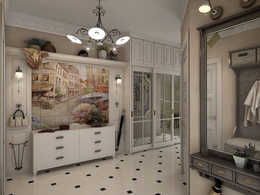 В прихожей стоит разместить небольшую люстру. Такой потолочный светильник при входе в дом сразу задает настроение и стиль. Не забудьте установить бра в зоне зеркала. Шнур в качестве выключателя на настенном изделии станет интересным стилистическим акцентом.