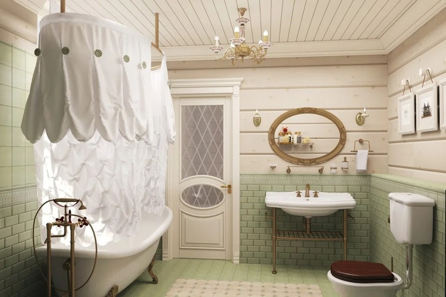 Для потолочного освещения ванной используйте точечные изделия с достаточной степенью влагозащиты. Если комната просторная, установка люстры придаст пространству атмосферу роскоши. Постарайтесь подобрать основание главного светильника в цвет сантехнических смесителей, полотенцесушителя и душевой стойки. Зачастую в стиле прованс они изготавливаются из латуни и бронзы с керамическим декором.