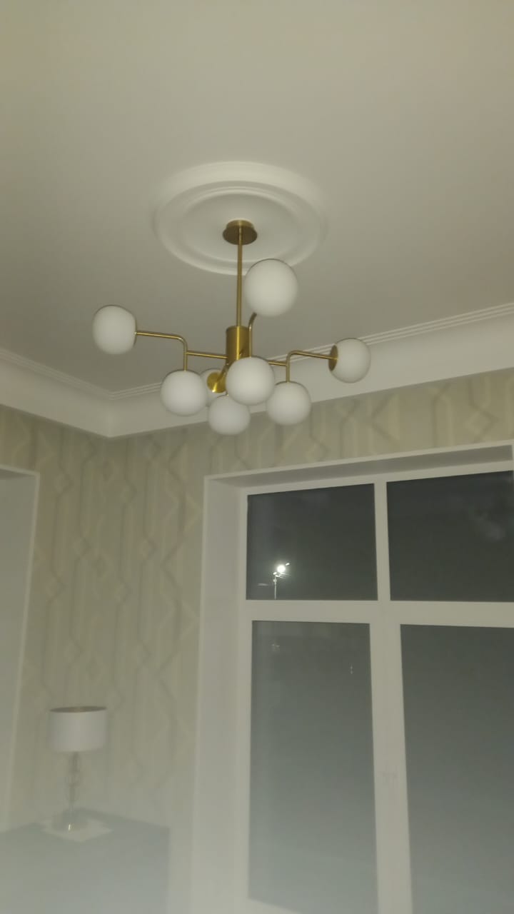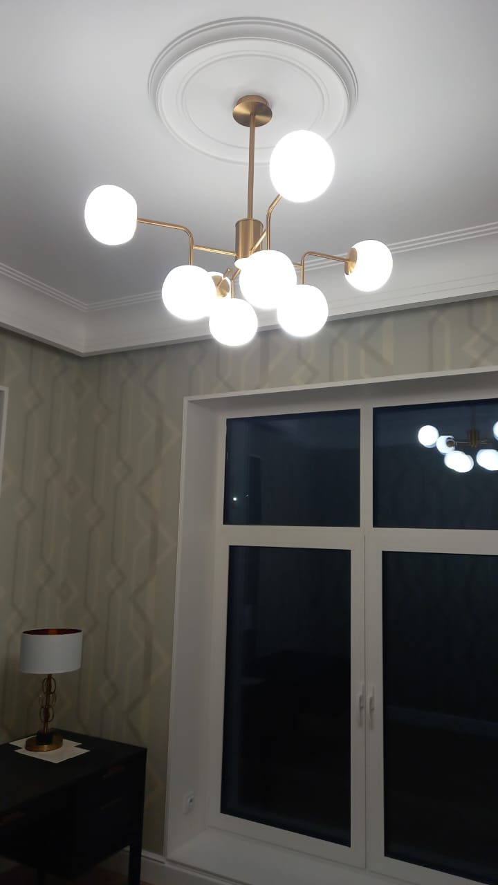 Люстра выглядит свежо и современно — без лишнего пафоса, но с чувством стиля. Золото не кричит, а спокойно подчеркивает форму. Свет мягкий, равномерный, при этом мощности хватает с запасом.