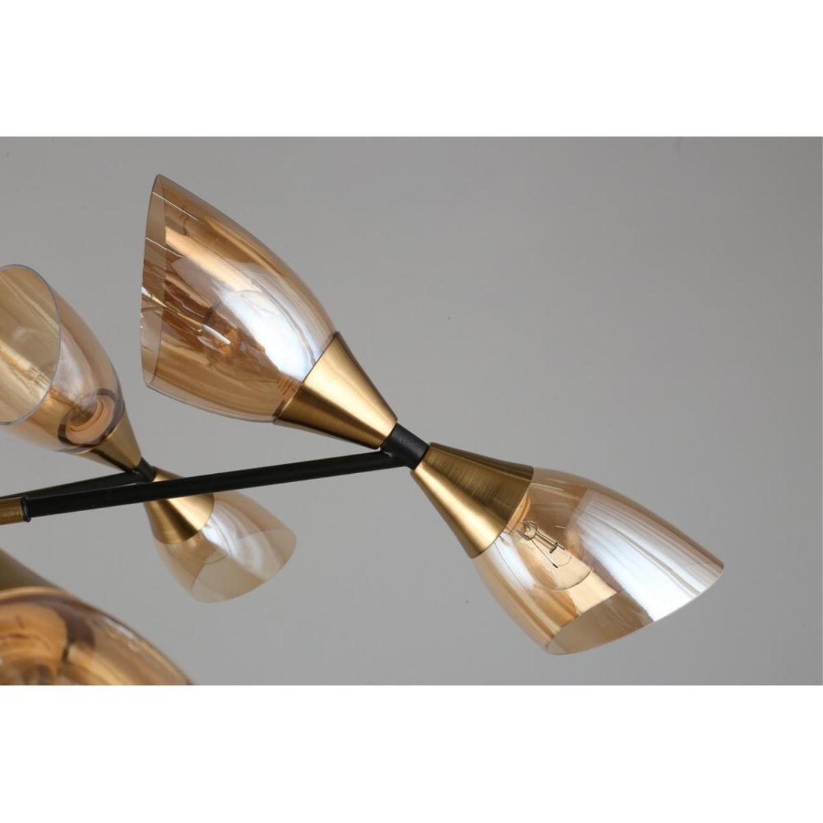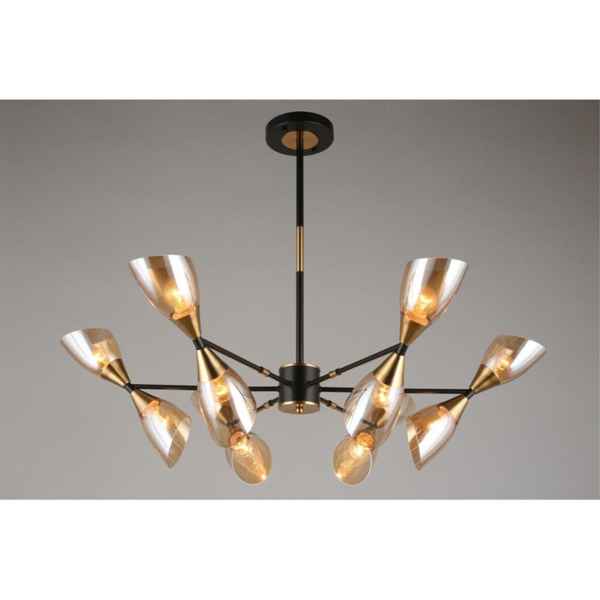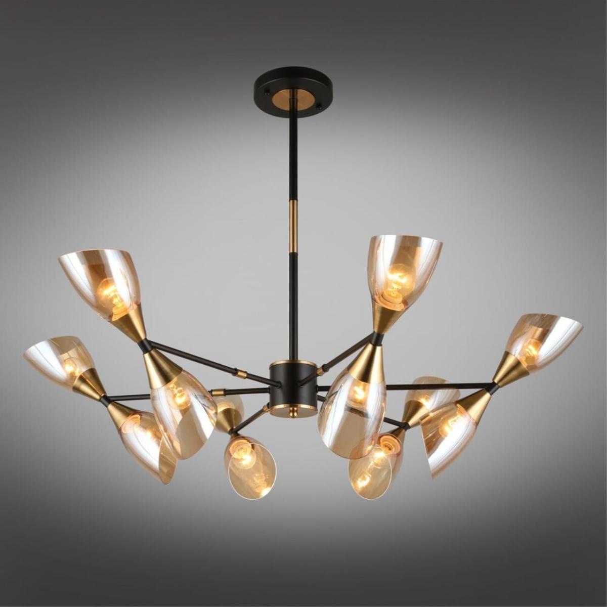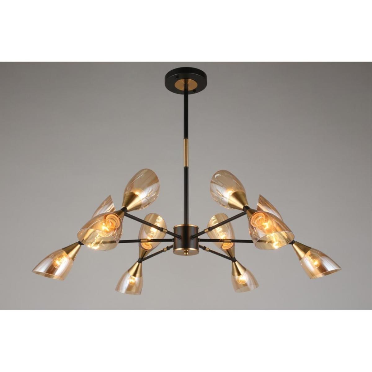 Диаметр 1000 мм и высота 700 мм. 12 поворотных плафонов из прозрачного стекла на металлической арматуре черного цвета. Цоколь E14, 12 ламп накаливания по 40 Вт, суммарная мощность 480 Вт, световой поток 5040 лм. Рекомендуемая площадь освещения до 24 кв. м. Питание 230 В, степень защиты IP20. Установка на потолок, подходит для натяжных потолков.