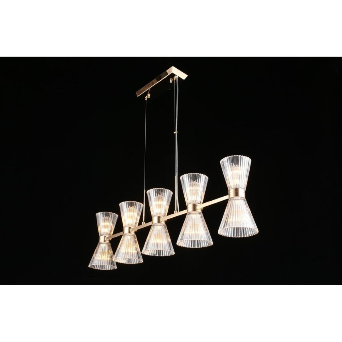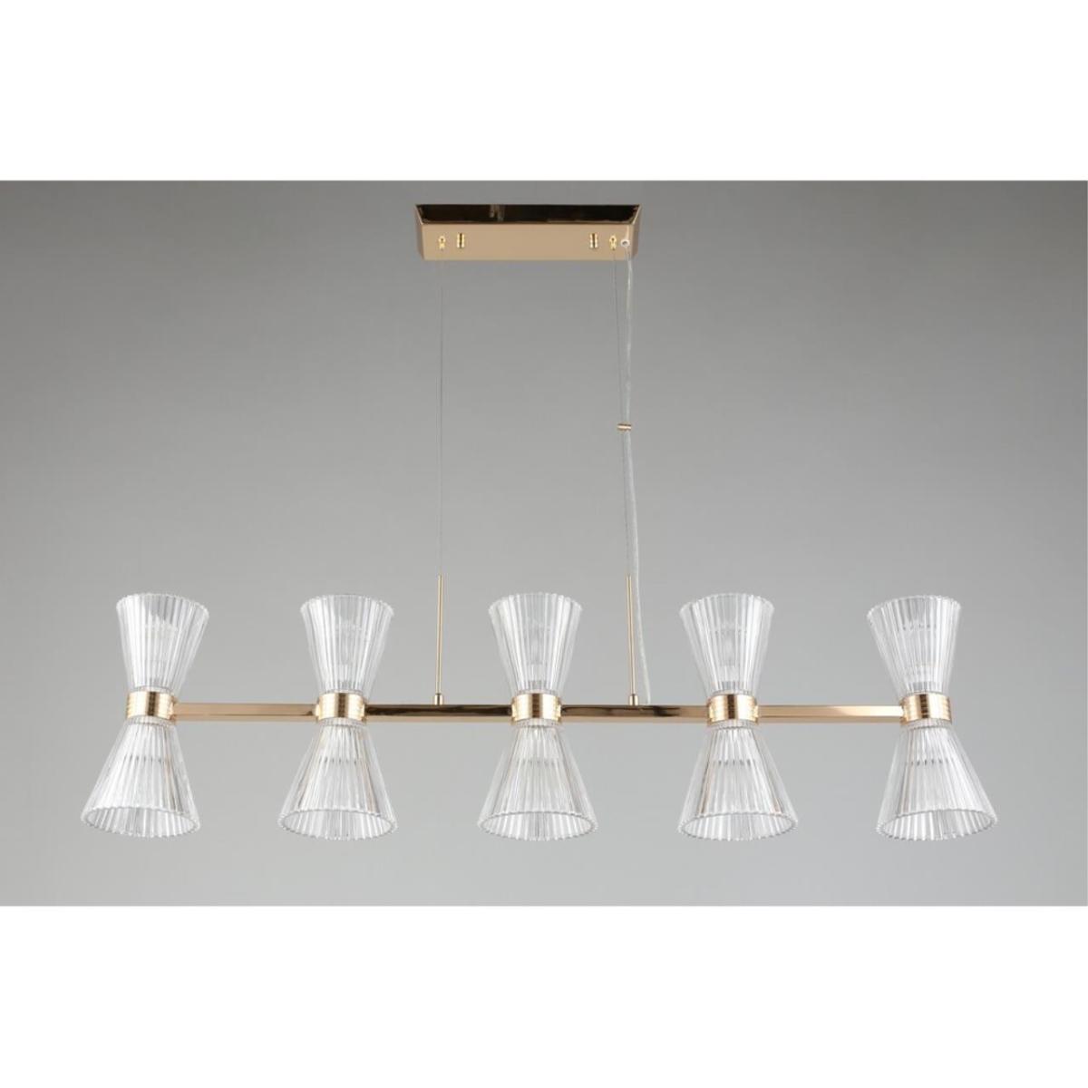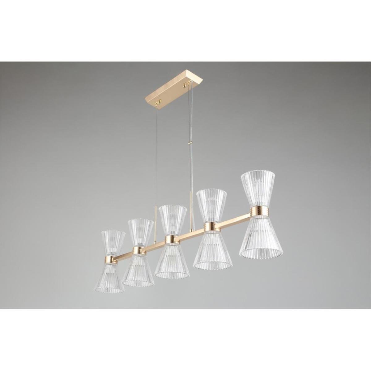 Подвесная люстра Aployt Elinor APL.801.03.10 создаёт выразительный акцент в современном интерьере кафе и ресторанов. Пять конусных плафонов из прозрачного стекла дают чистый, живой свет, а арматура цвета золото добавляет теплоты и статуса. Лаконичный силуэт коллекции Elinor подойдёт для залов, барных зон и столовых групп.