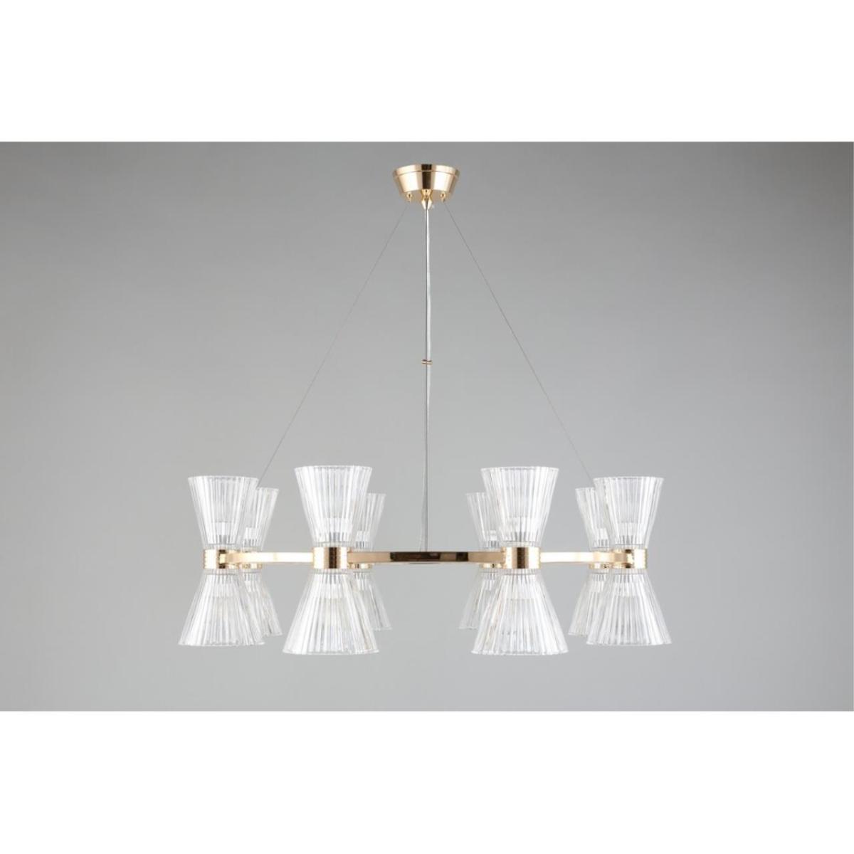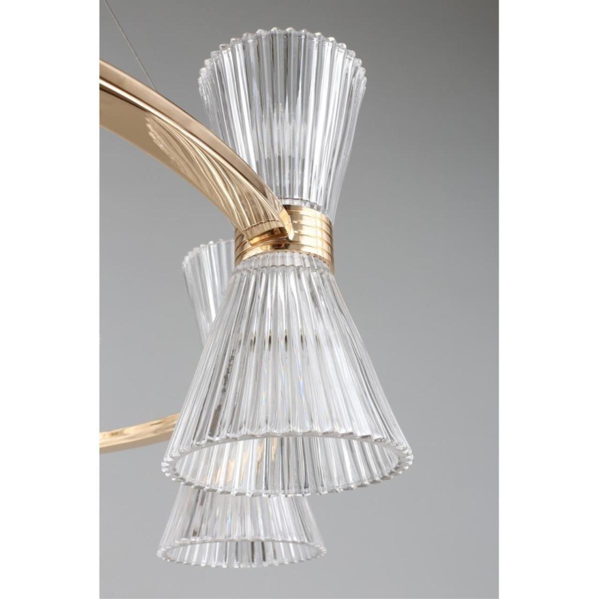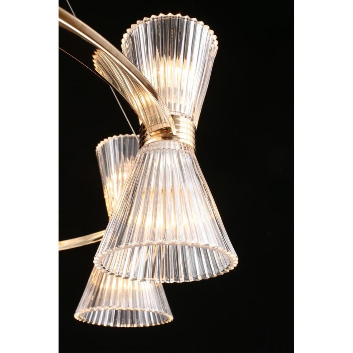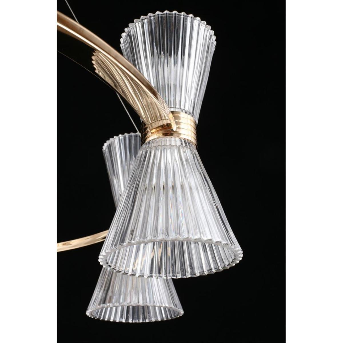 Размеры светильника удобны для просторных залов и холлов: диаметр 850 мм, высота 350 мм. Прозрачное стекло плафонов визуально облегчает композицию, а золотистый металл добавляет интерьеру ощущение камерной роскоши без перегрузки.