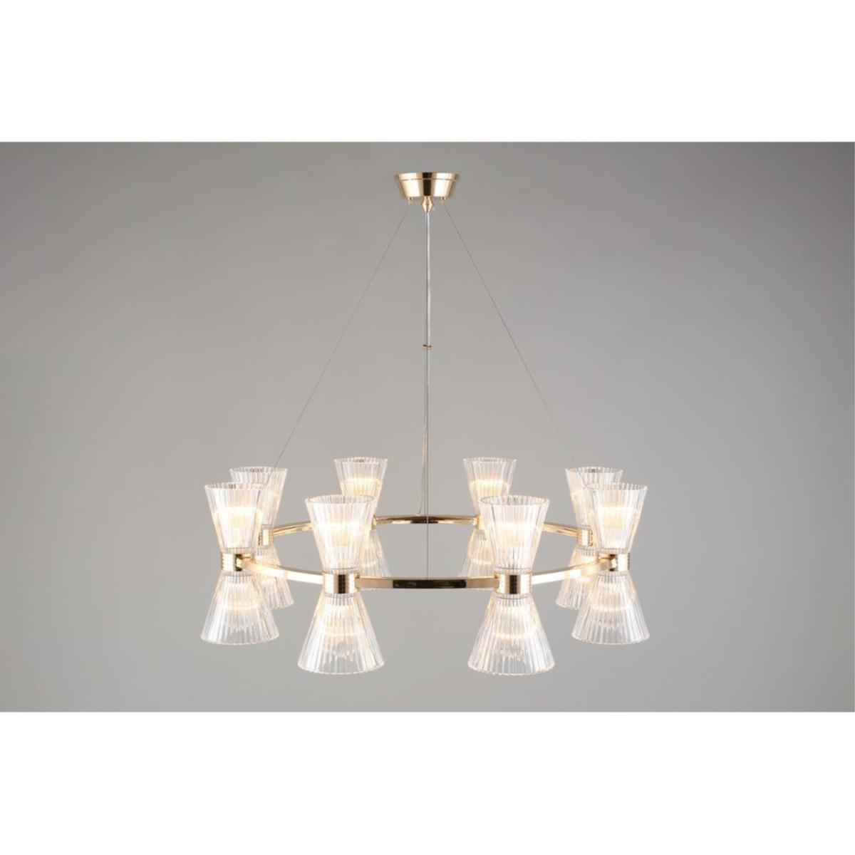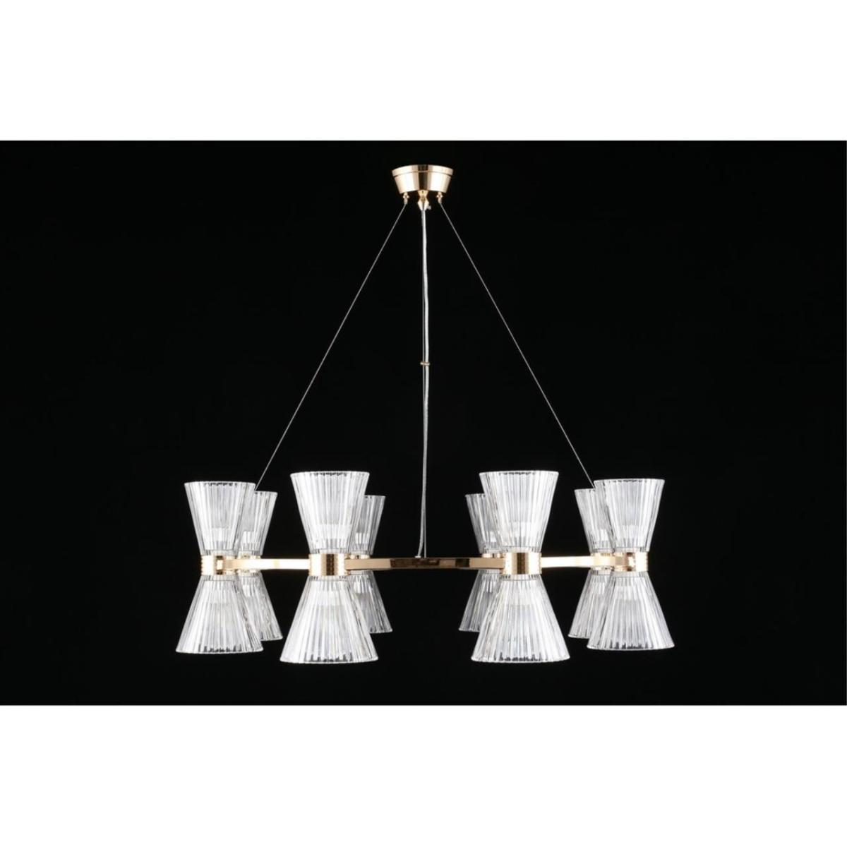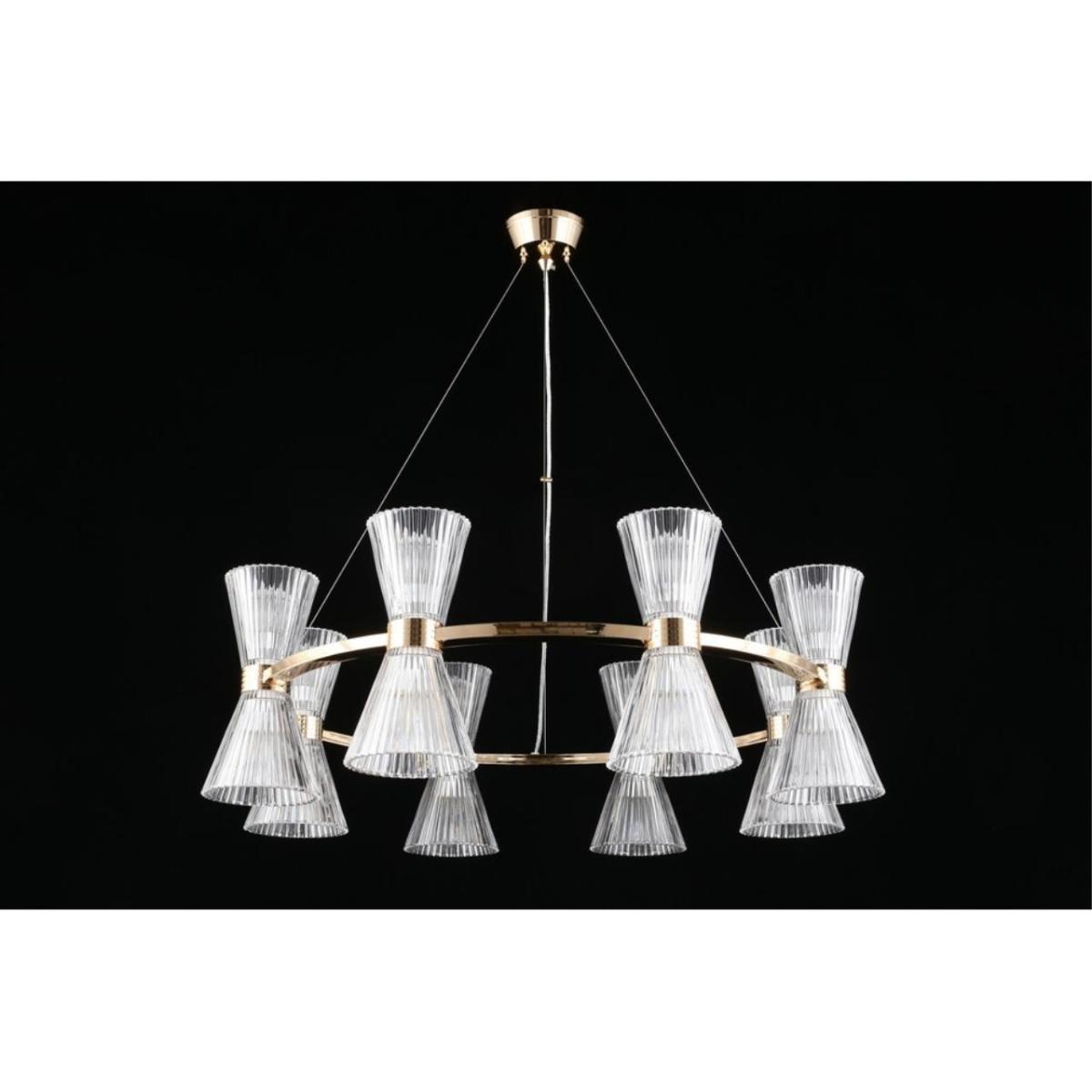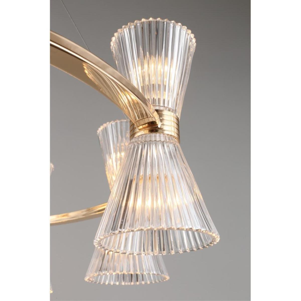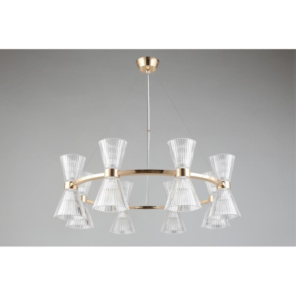Размеры светильника удобны для просторных залов и холлов: диаметр 850 мм, высота 350 мм. Прозрачное стекло плафонов визуально облегчает композицию, а золотистый металл добавляет интерьеру ощущение камерной роскоши без перегрузки.