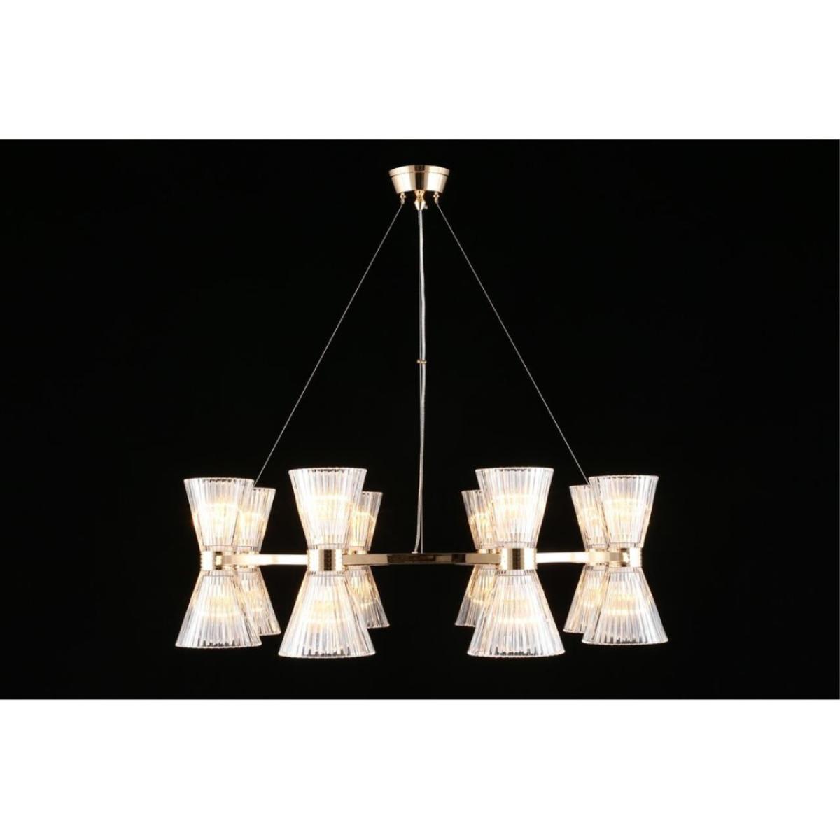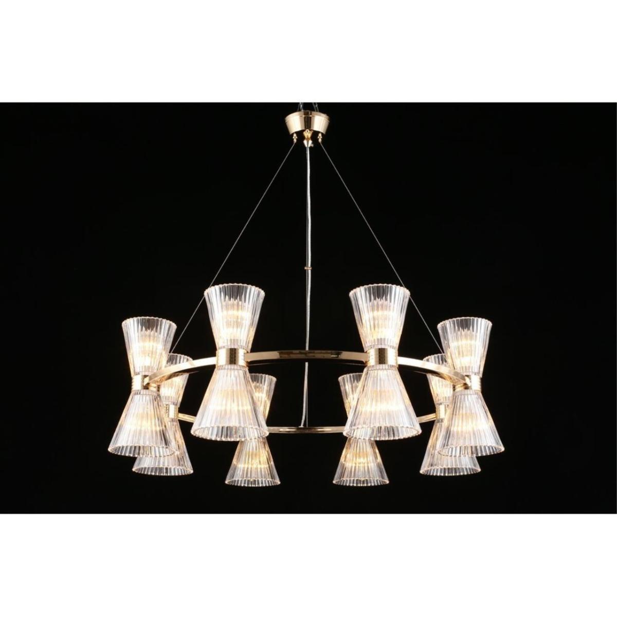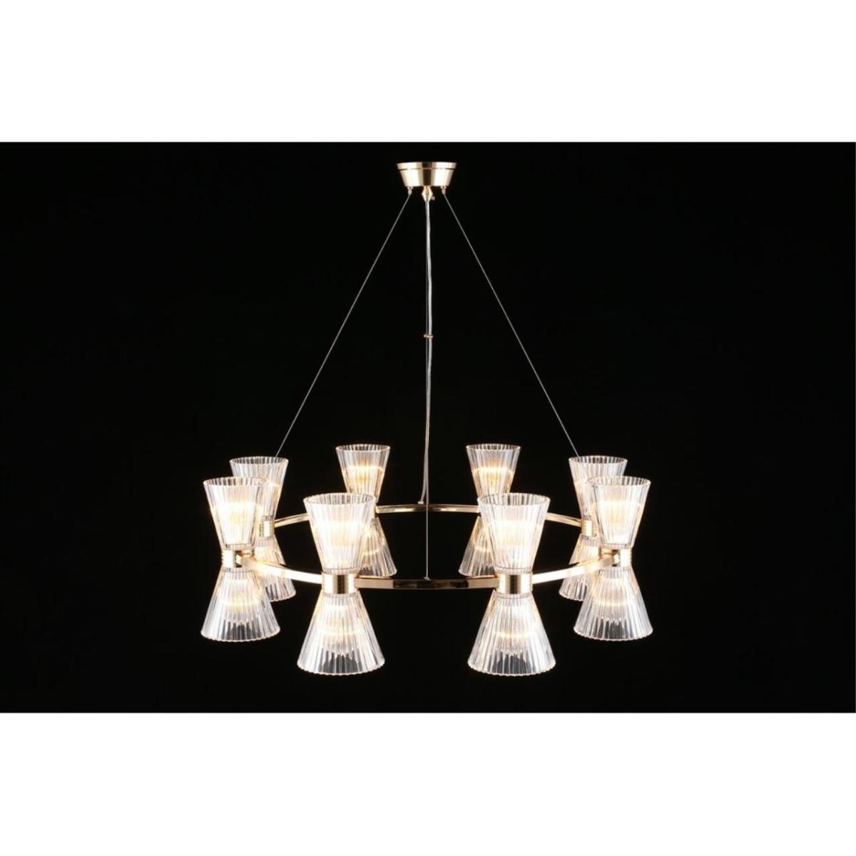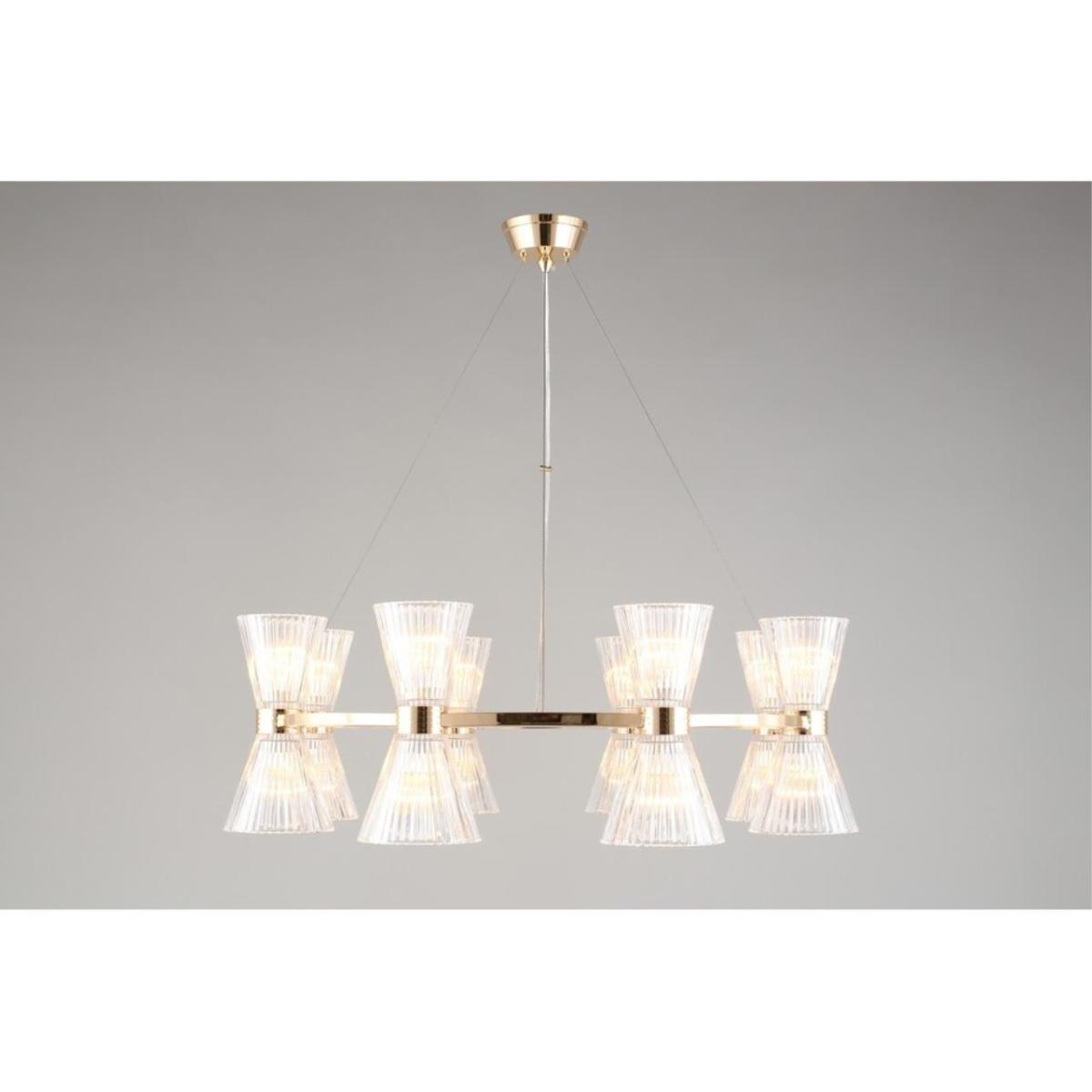 Размеры светильника удобны для просторных залов и холлов: диаметр 850 мм, высота 350 мм. Прозрачное стекло плафонов визуально облегчает композицию, а золотистый металл добавляет интерьеру ощущение камерной роскоши без перегрузки.