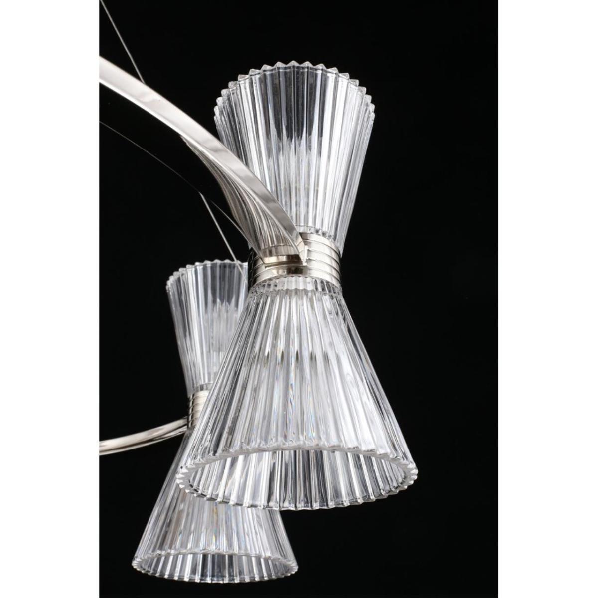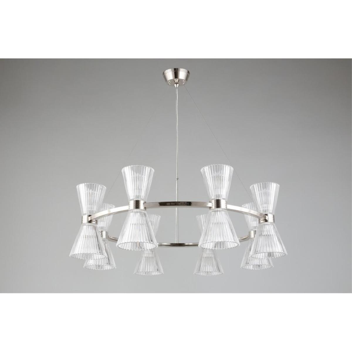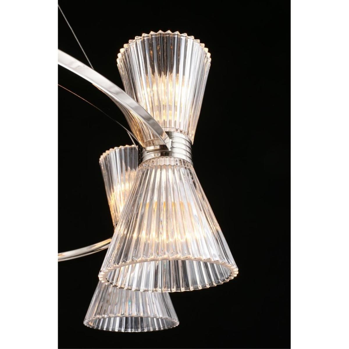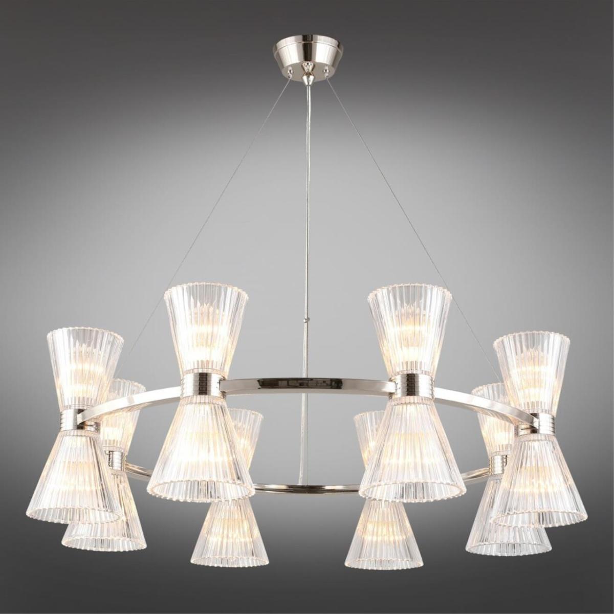 Подвесная люстра Aployt Elinor APL.801.13.16 наполняет зал ясным и мягким сиянием, прозрачные конусные плафоны раскрывают свет, а хромированная арматура добавляет прохладный блеск. Восемь стеклянных конусов направлены в стороны, поэтому интерьер получает объемное, равномерное освещение без резких теней. Диаметр 850 мм при высоте 350 мм сохраняет легкость силуэта, люстра читается графично и аккуратно. Внутри 16 ламп накаливания E14 по 40 Вт, суммарная мощность 640 Вт, световой поток 6720 лм, этого достаточно для площади до 32 м² в зале ресторана или просторной гостиной.