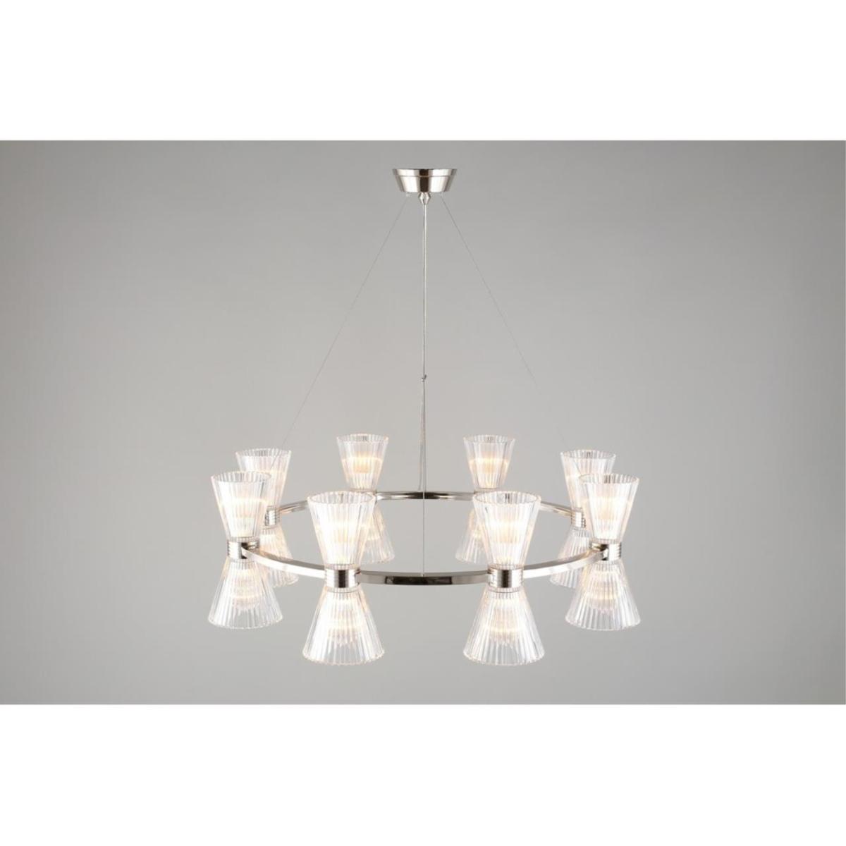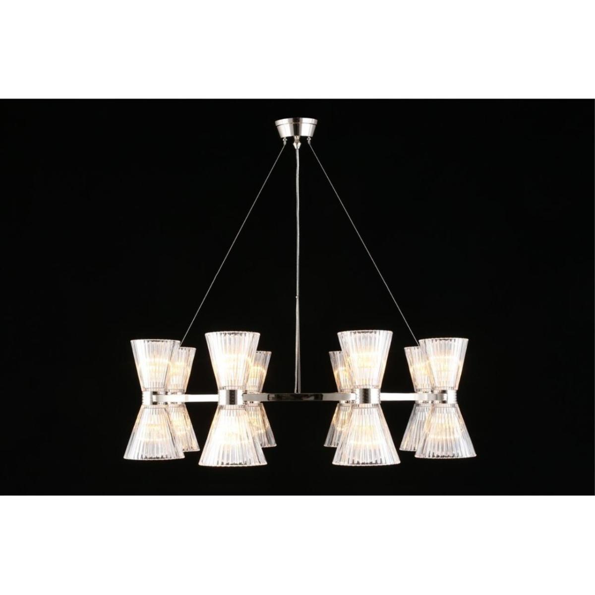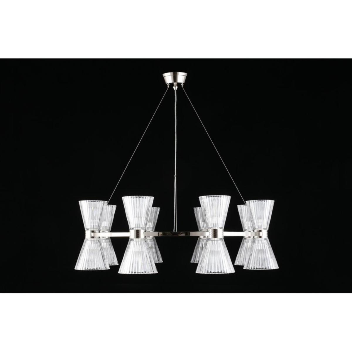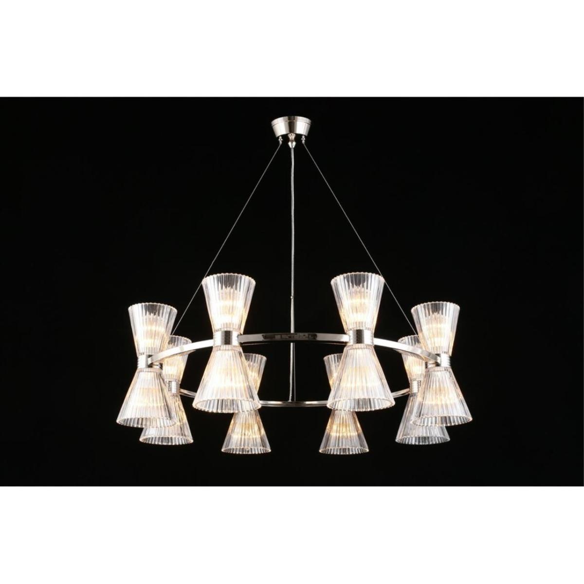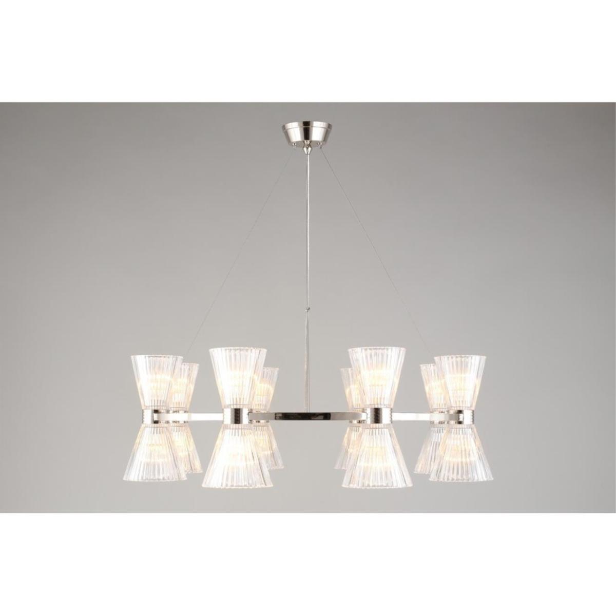 Подвесная люстра Aployt Elinor APL.801.13.16 наполняет зал ясным и мягким сиянием, прозрачные конусные плафоны раскрывают свет, а хромированная арматура добавляет прохладный блеск. Восемь стеклянных конусов направлены в стороны, поэтому интерьер получает объемное, равномерное освещение без резких теней. Диаметр 850 мм при высоте 350 мм сохраняет легкость силуэта, люстра читается графично и аккуратно. Внутри 16 ламп накаливания E14 по 40 Вт, суммарная мощность 640 Вт, световой поток 6720 лм, этого достаточно для площади до 32 м² в зале ресторана или просторной гостиной.