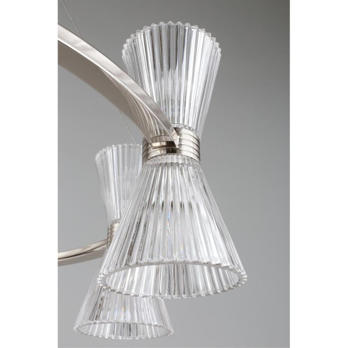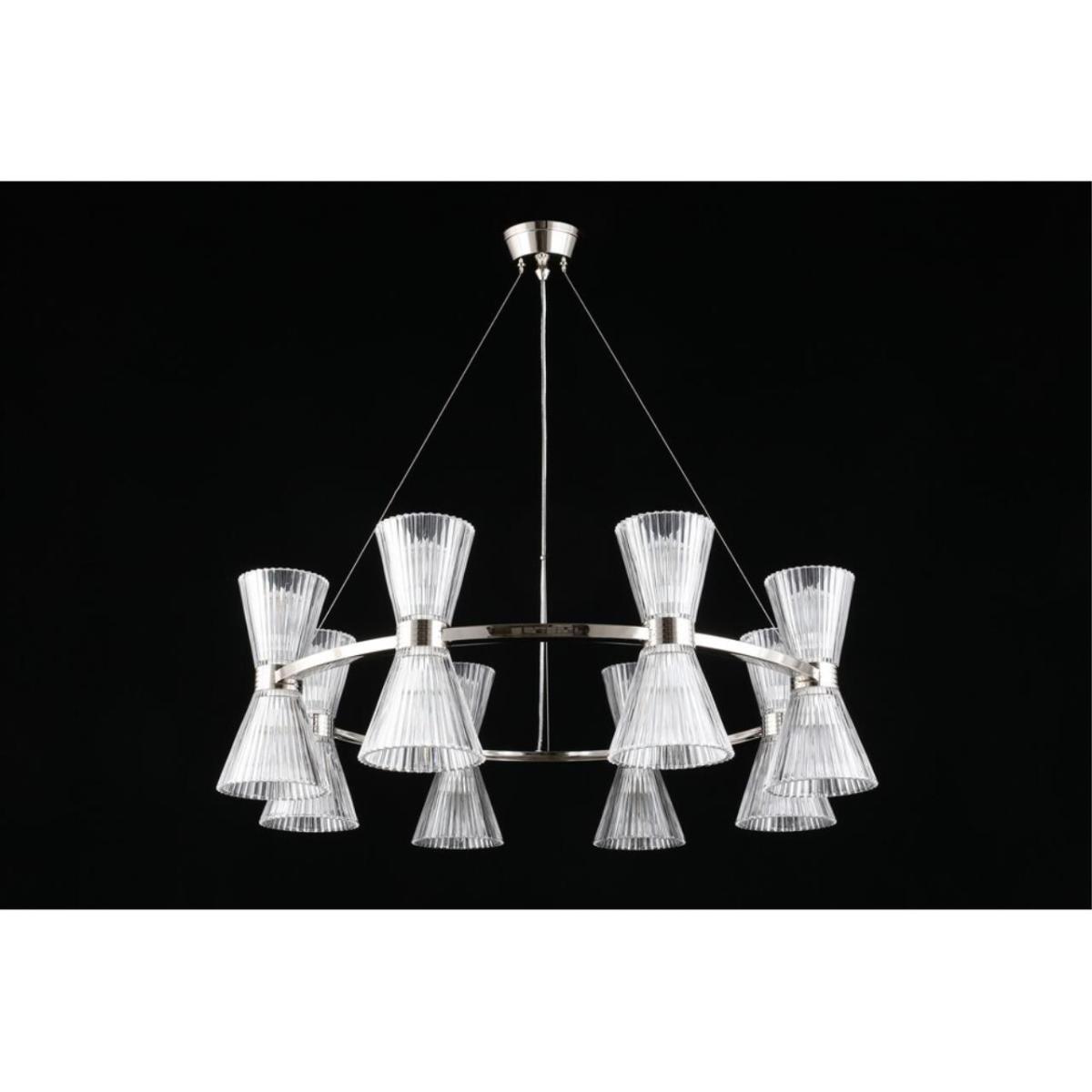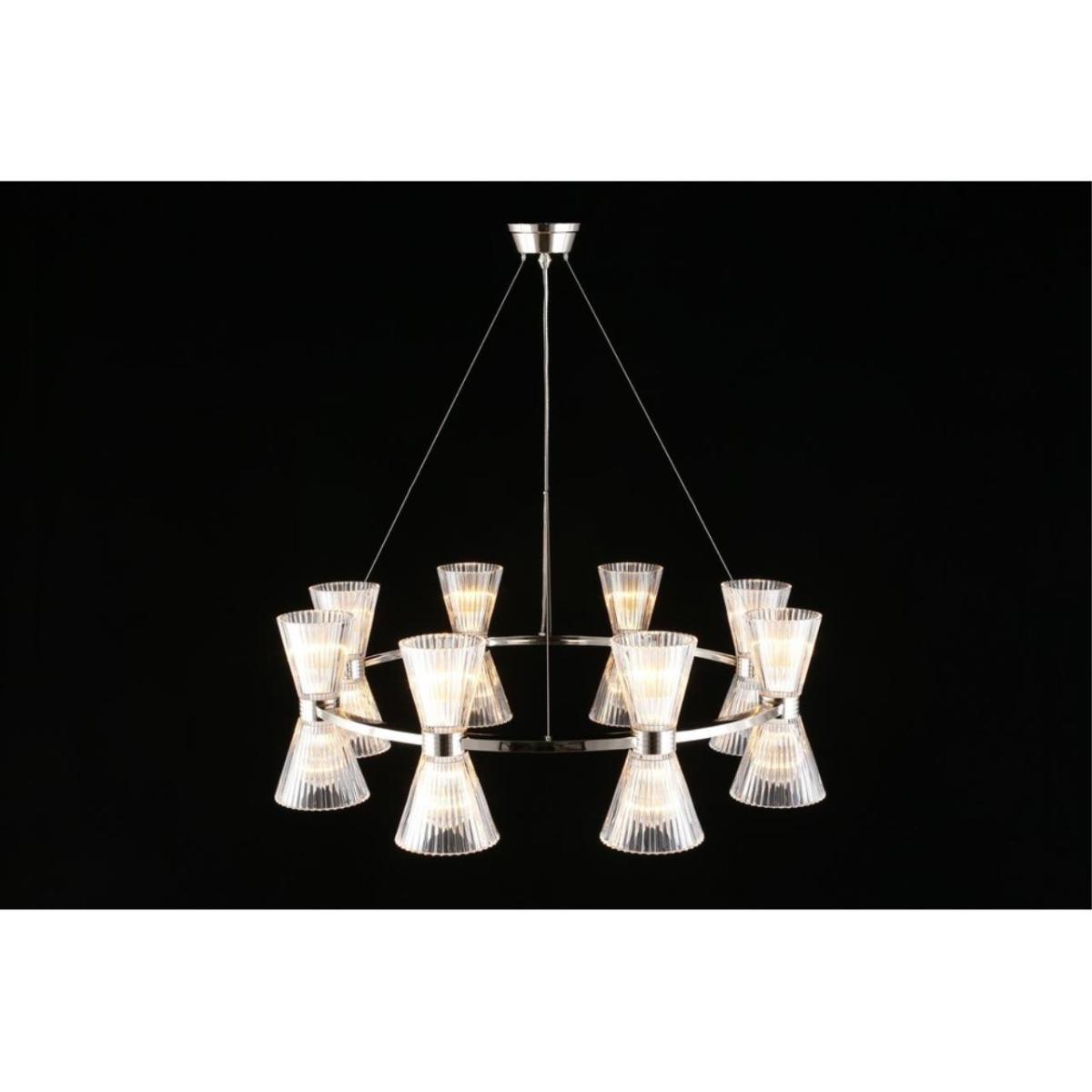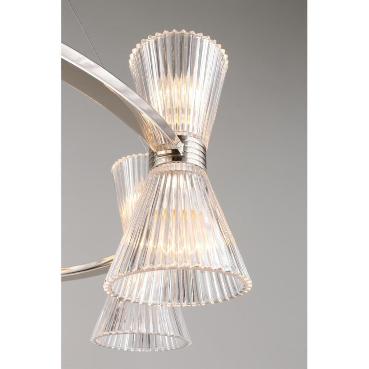Подвесная люстра Aployt Elinor APL.801.13.16 наполняет зал ясным и мягким сиянием, прозрачные конусные плафоны раскрывают свет, а хромированная арматура добавляет прохладный блеск. Восемь стеклянных конусов направлены в стороны, поэтому интерьер получает объемное, равномерное освещение без резких теней. Диаметр 850 мм при высоте 350 мм сохраняет легкость силуэта, люстра читается графично и аккуратно. Внутри 16 ламп накаливания E14 по 40 Вт, суммарная мощность 640 Вт, световой поток 6720 лм, этого достаточно для площади до 32 м² в зале ресторана или просторной гостиной.