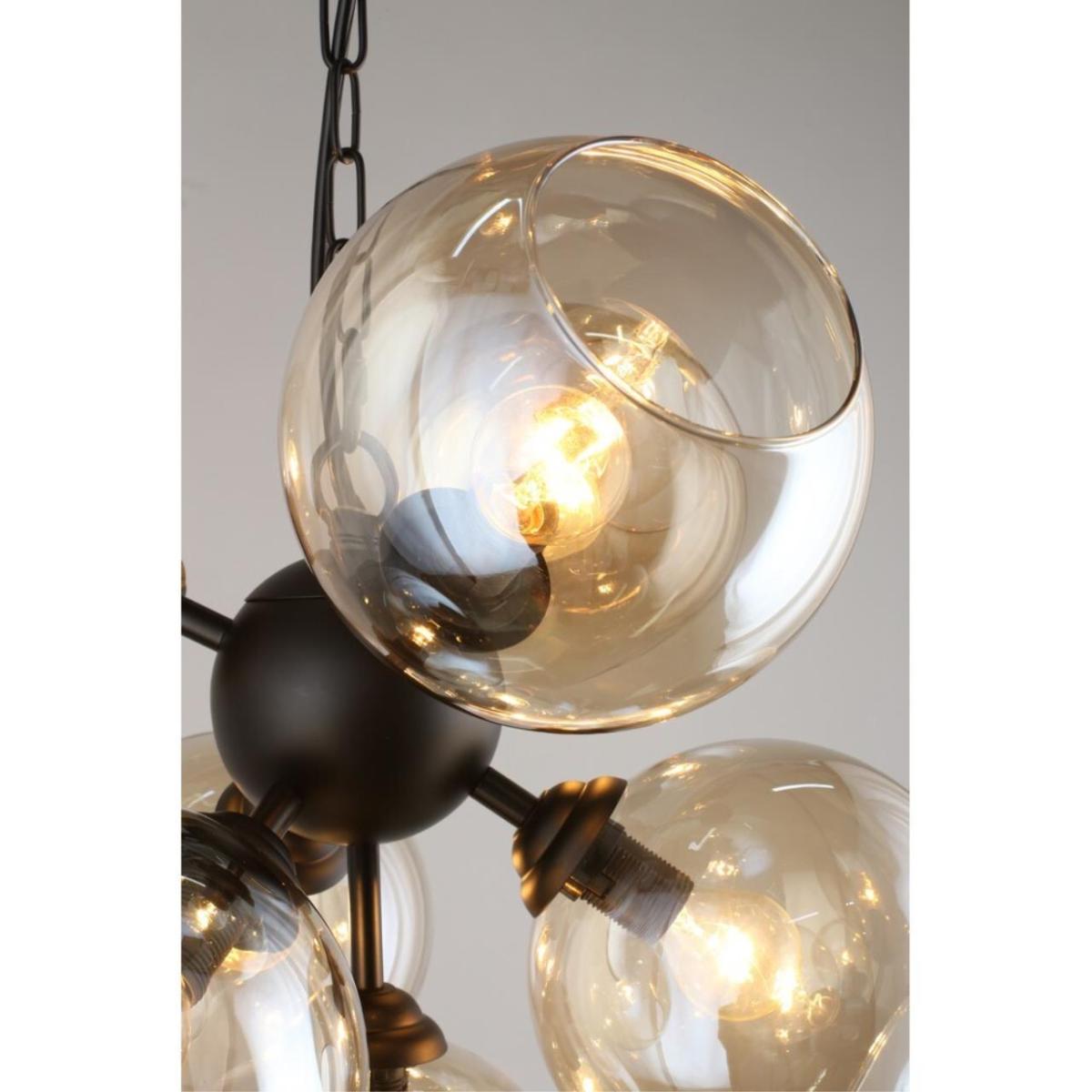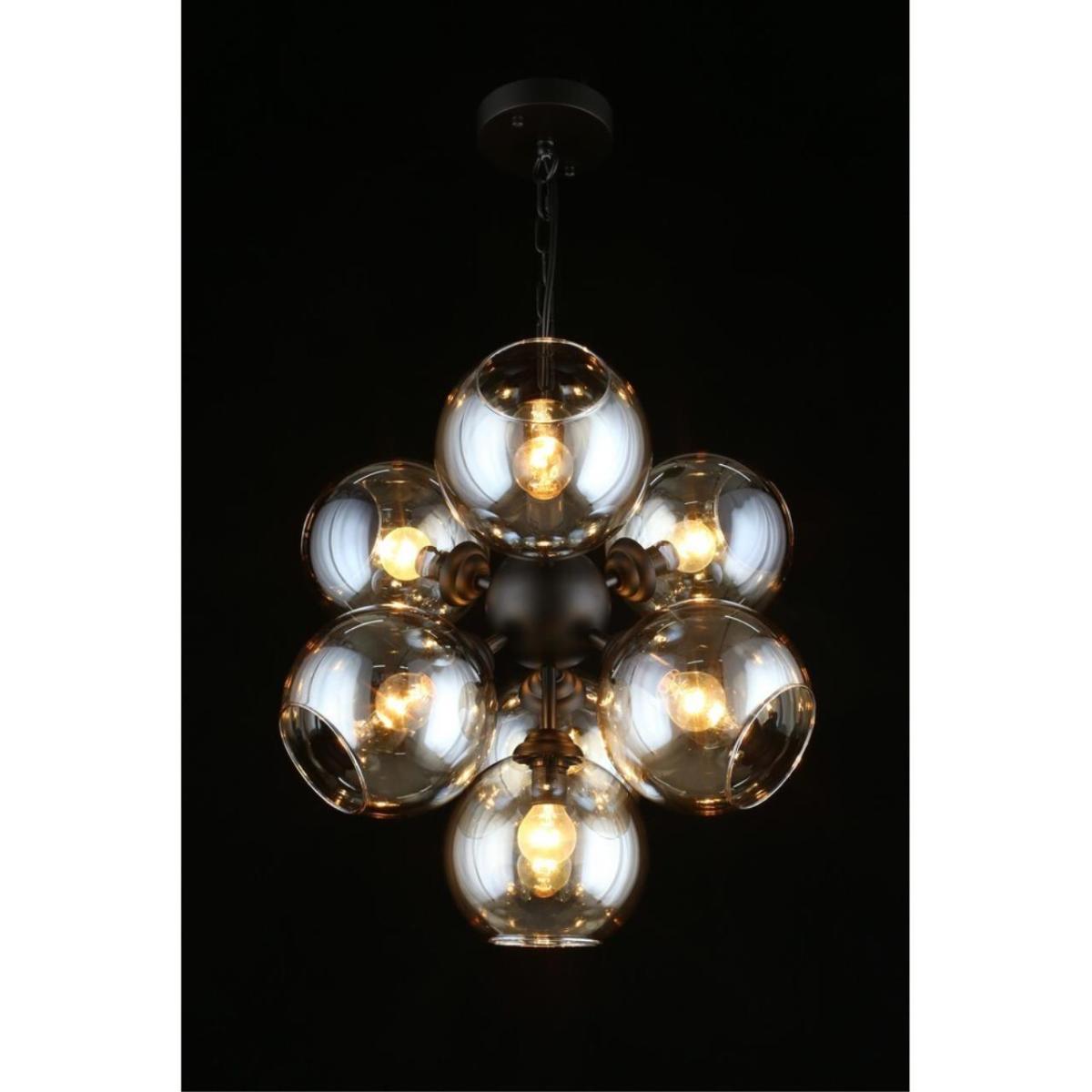 Дымчатое стекло смягчает яркость, черная арматура подчеркивает геометрию пространства, а семь источников света помогают создать комфортный сценарий в гостиной или столовой зоне.