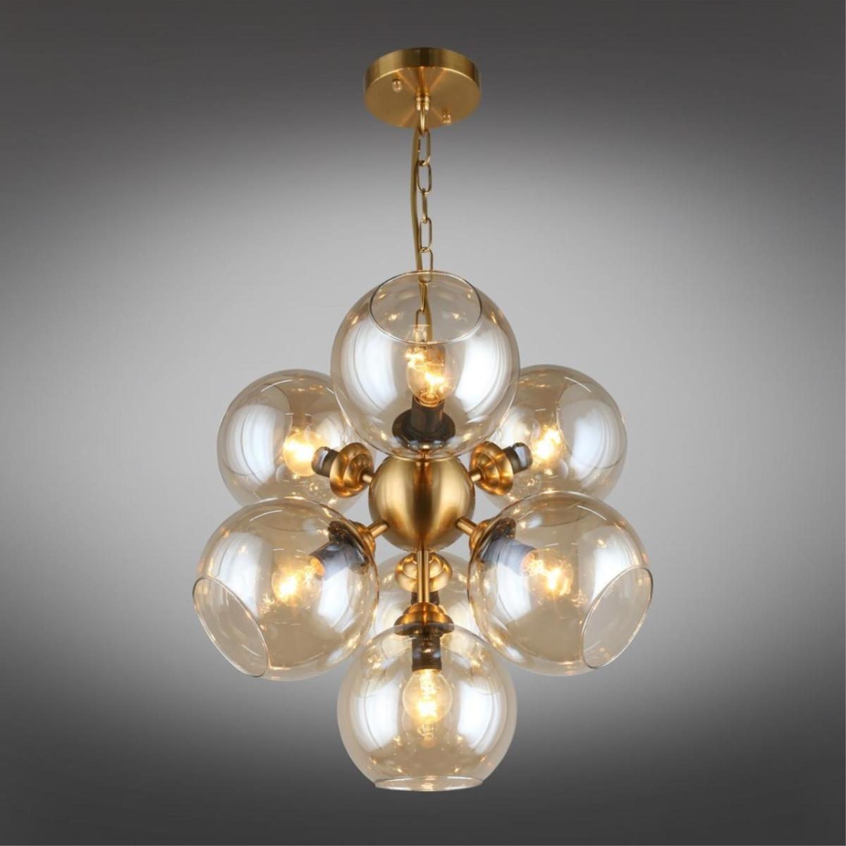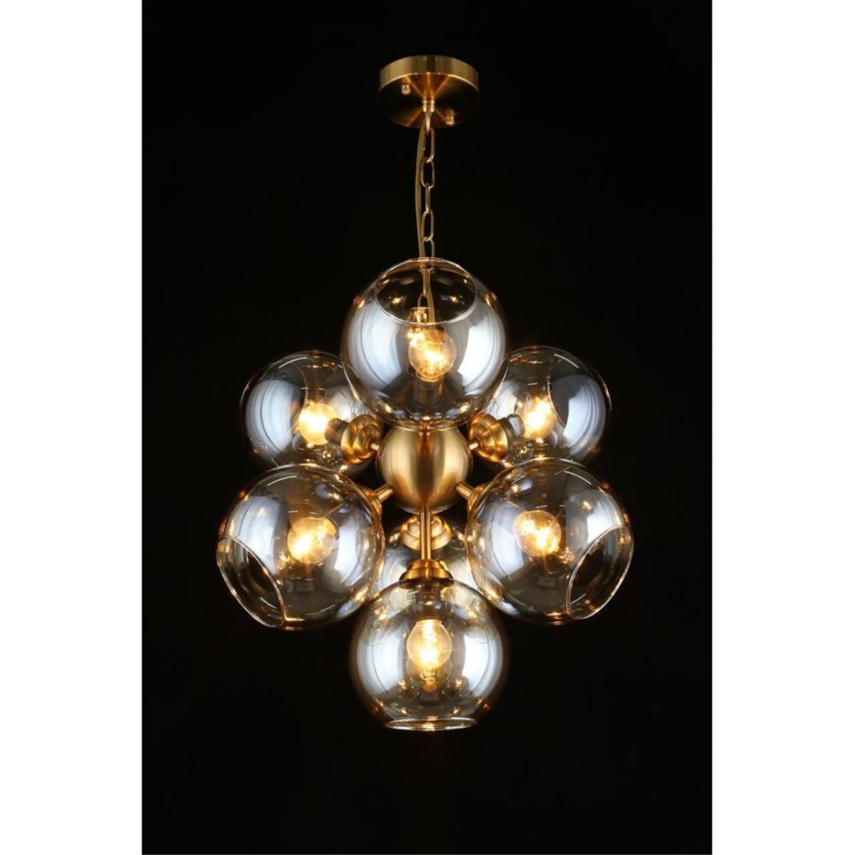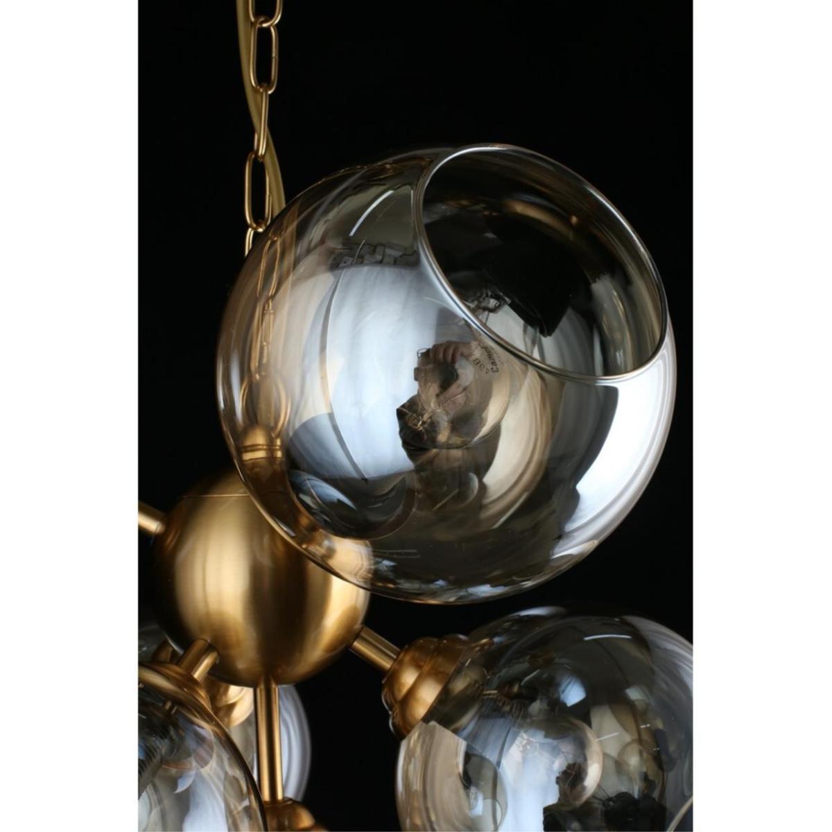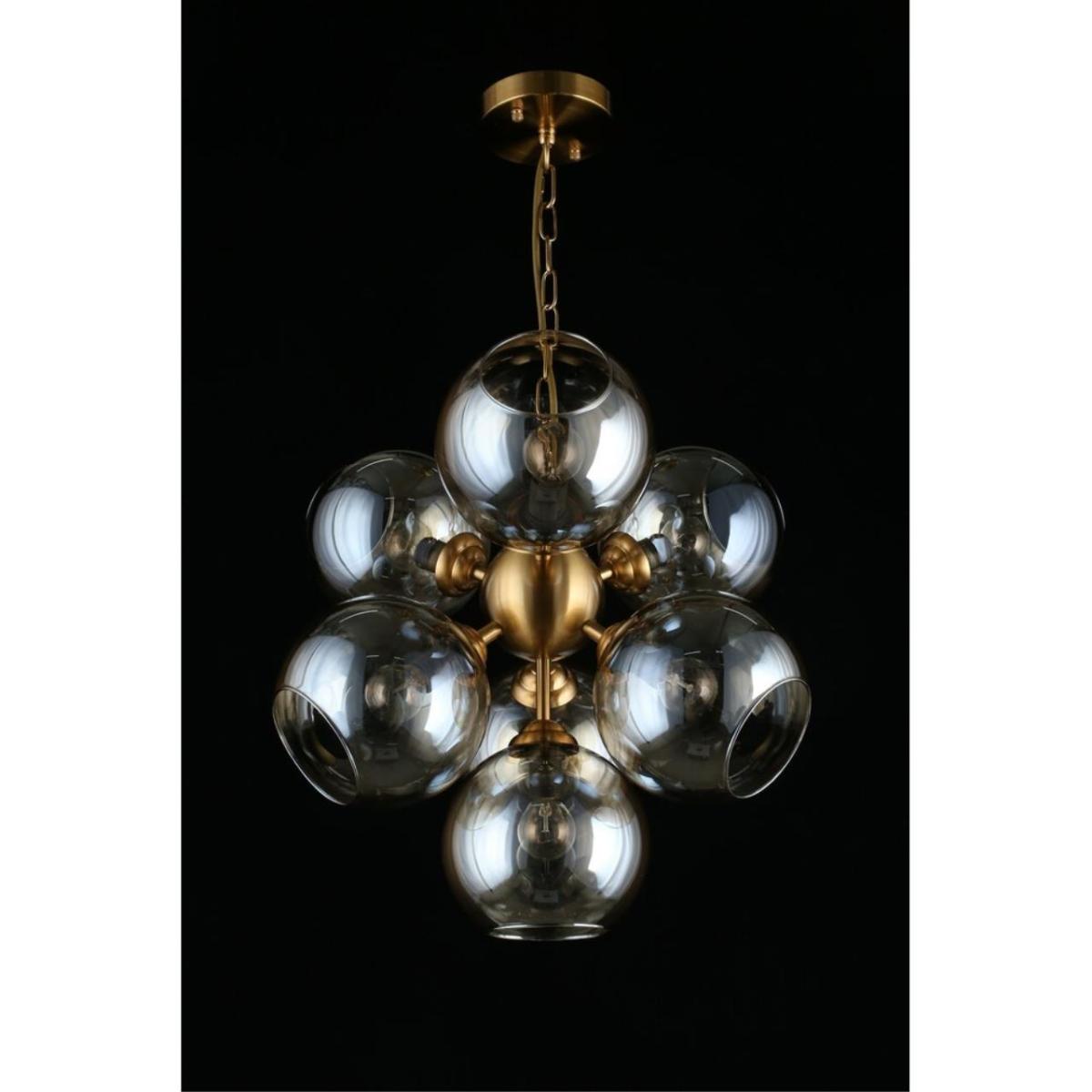 Арматура из металла, цвет бронза. Семь сферических плафонов из дымчатого стекла направлены в стороны, количество плафонов соответствует количеству ламп.