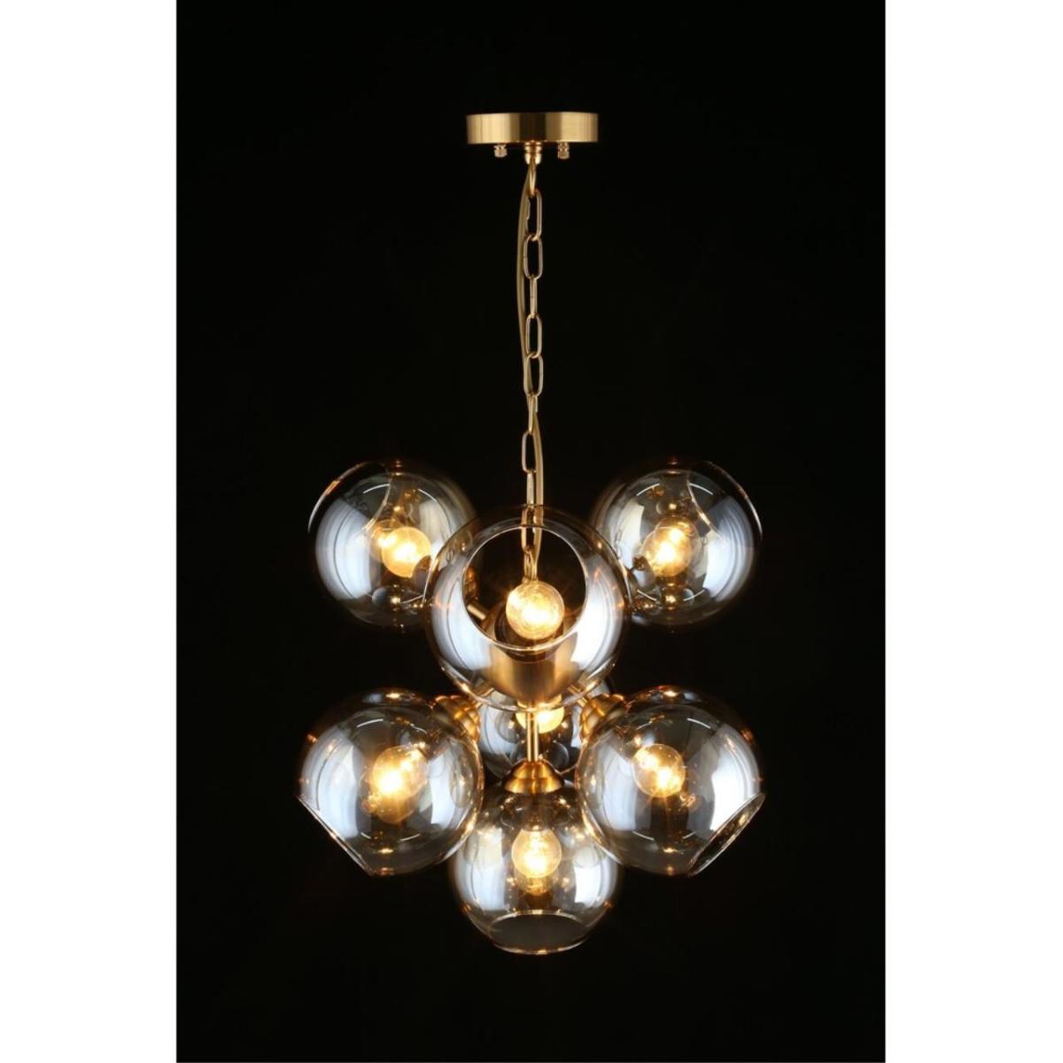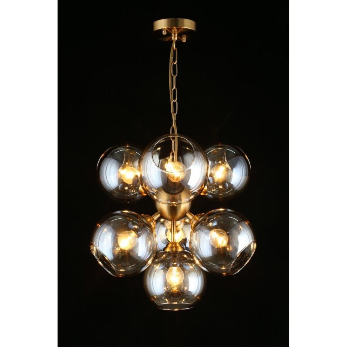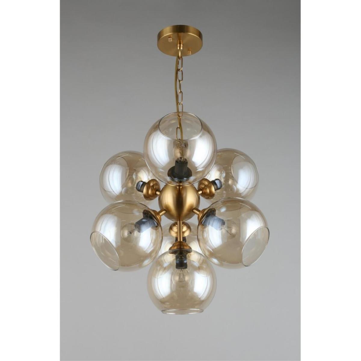 Арматура из металла, цвет бронза. Семь сферических плафонов из дымчатого стекла направлены в стороны, количество плафонов соответствует количеству ламп.