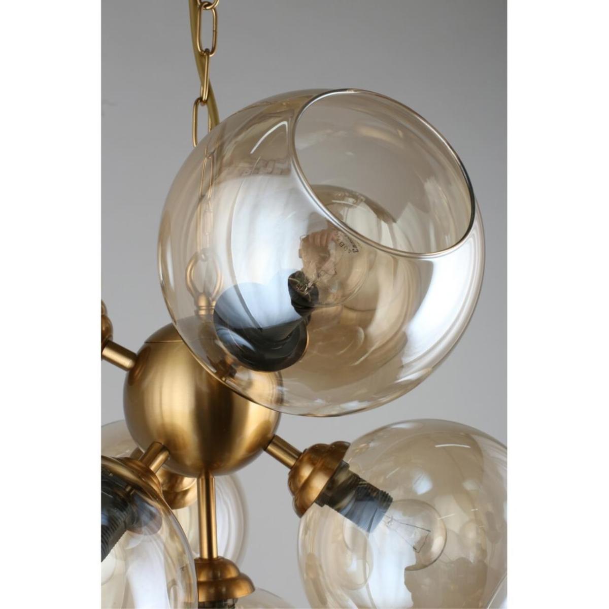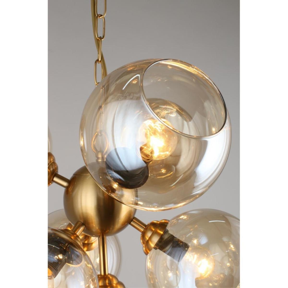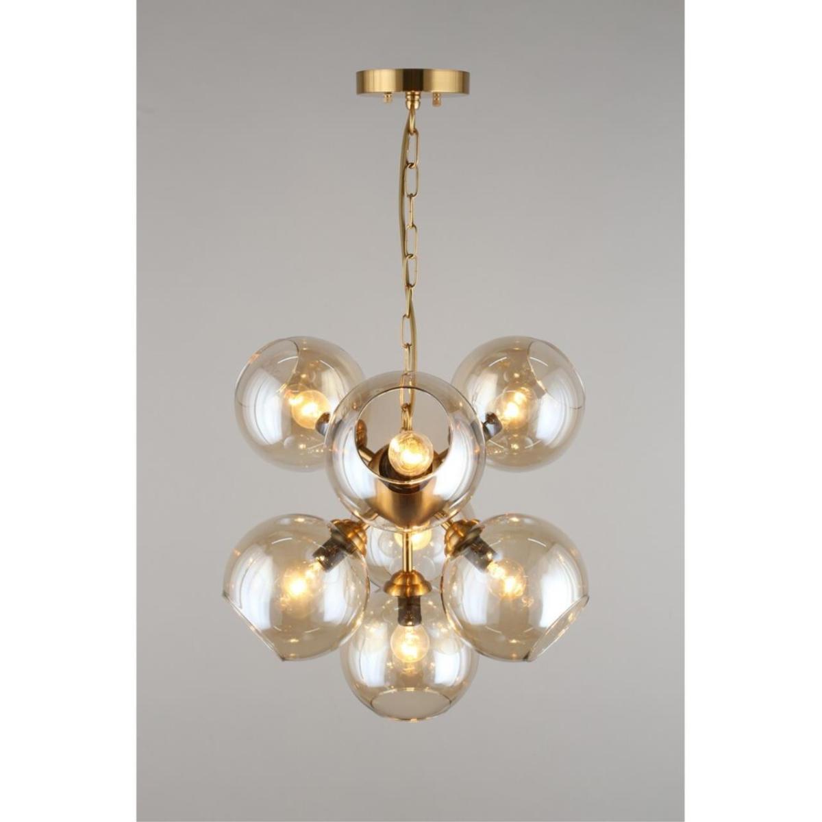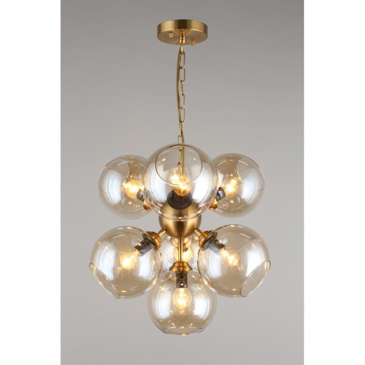 Арматура из металла, цвет бронза. Семь сферических плафонов из дымчатого стекла направлены в стороны, количество плафонов соответствует количеству ламп.