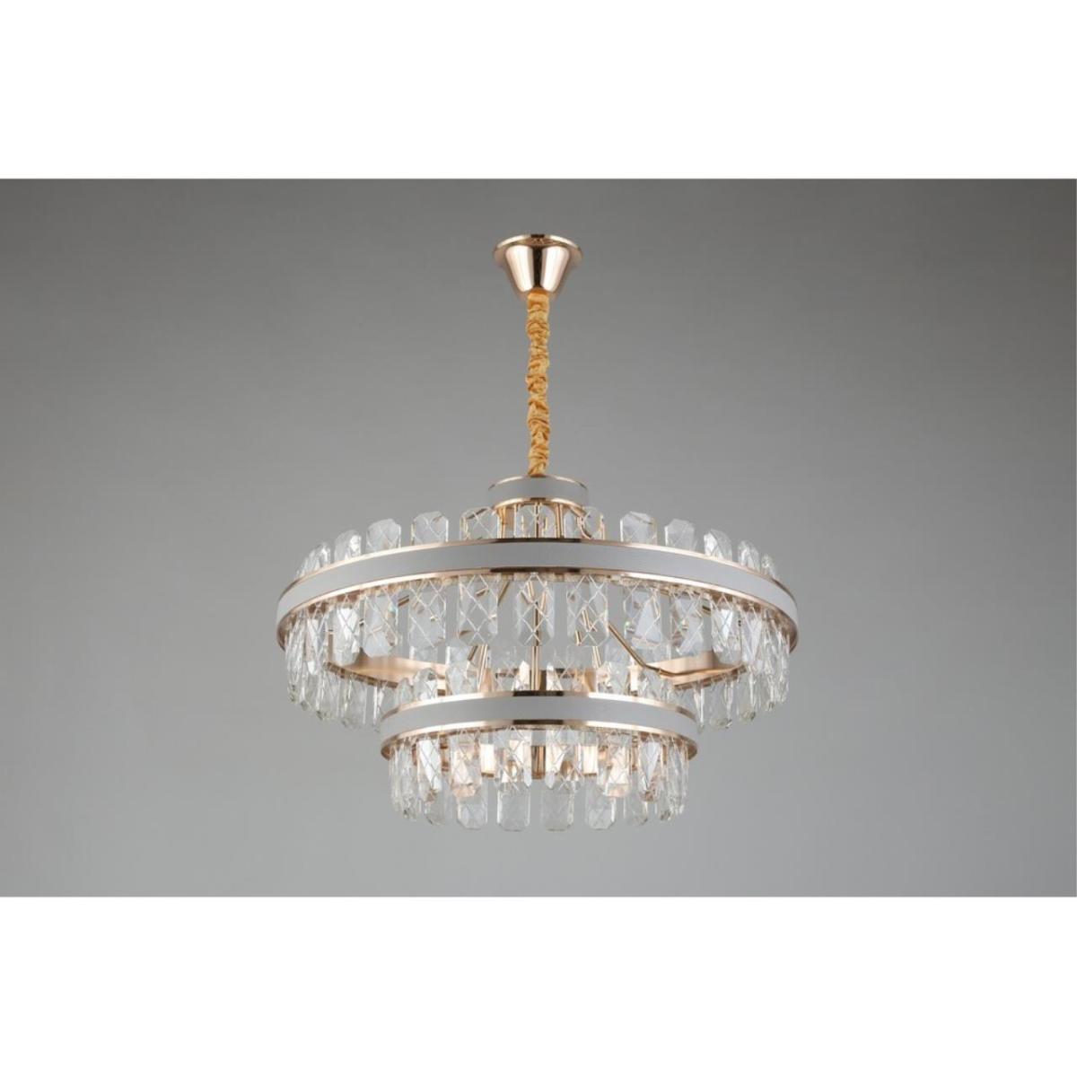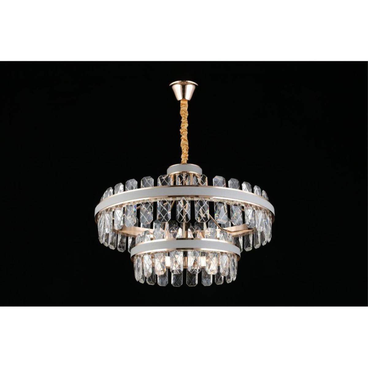 Габариты: диаметр 750 мм, высота 1600 мм. Конструкция совместима с натяжными потолками. Форма плафонов — кольцо, количество плафонов — 2.