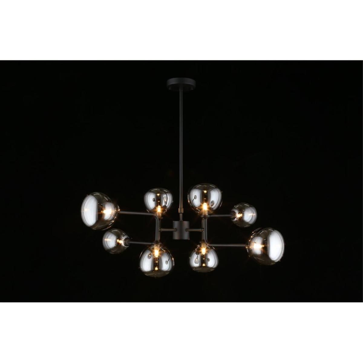 Подвесная люстра Aployt Roser APL.913.07.08 создает выразительный световой акцент в современной гостиной. Диаметр 800 мм и высота 450 мм визуально выстраивают пространство, а восемь овальных плафонов из дымчатого стекла направлены в стороны и дают мягкое, объемное сияние без бликов. Черная металлическая арматура подчеркивает стиль хай-тек и выглядит строго и актуально.