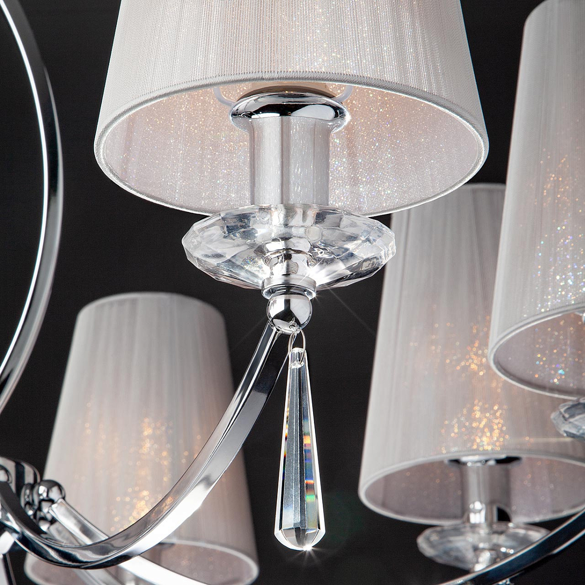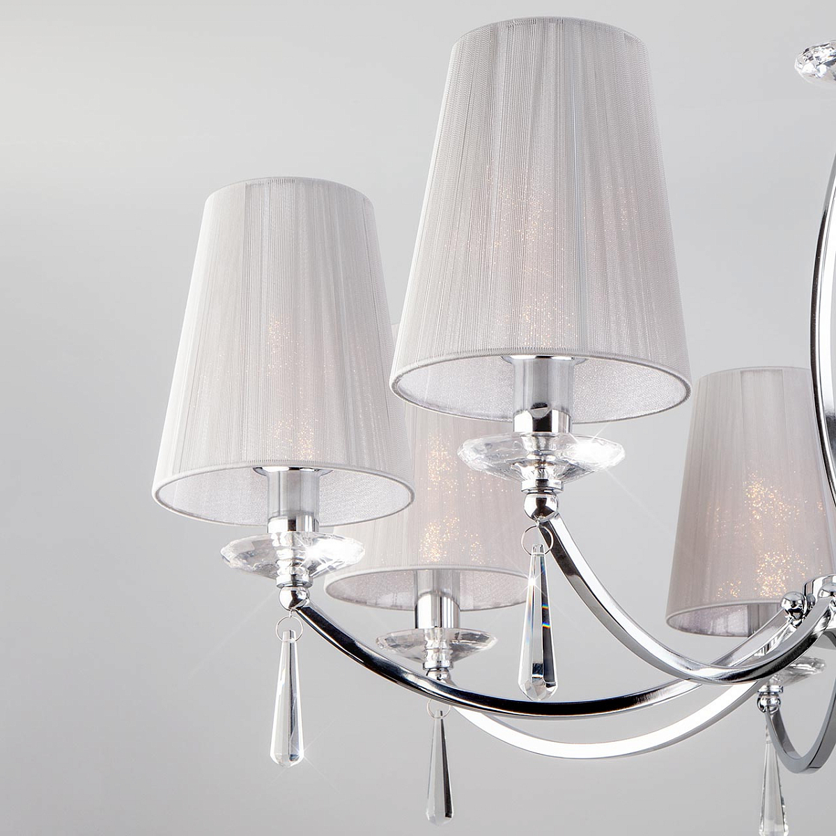 Хромированная арматура из металла образует изящный каркас, а восемь конусных текстильных плафонов серого цвета направлены вверх. Свет распределяется равномерно и мягко, без жестких бликов. Диаметр 780 мм и высота 430 мм помогают сохранить пропорции даже в комнате со стандартным потолком. Монтаж потолочный, совместимость с натяжными потолками подтверждена.