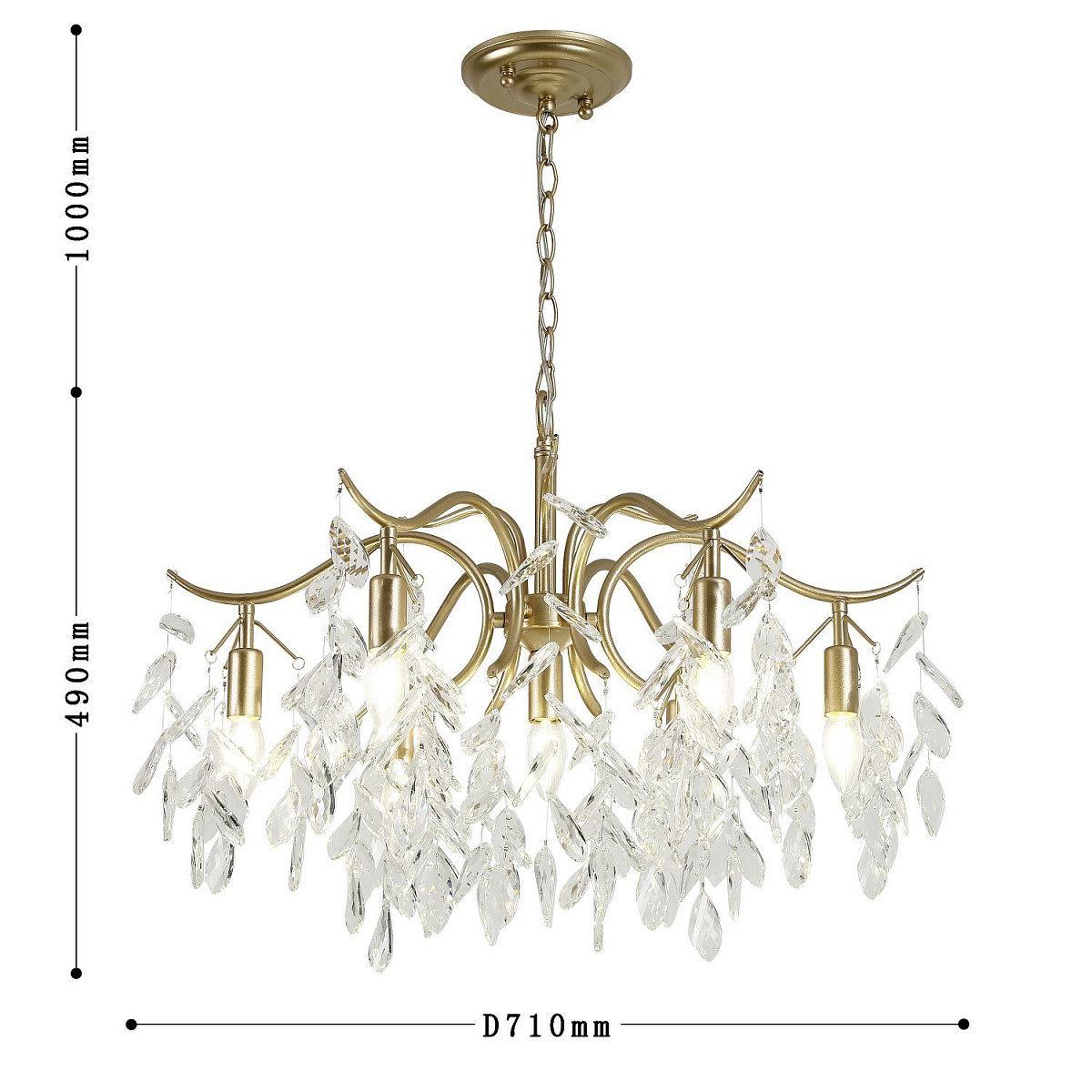 Диаметр 710 мм делает модель выразительным центром комнаты, высота 1490 мм подчеркивает архитектуру пространства. Семь ламп E14 по 40 Вт дают уверенный световой поток для площади около 14 м², свет направлен вниз, поэтому поверхность стола или зоны общения выглядит особенно уютно и собранно.