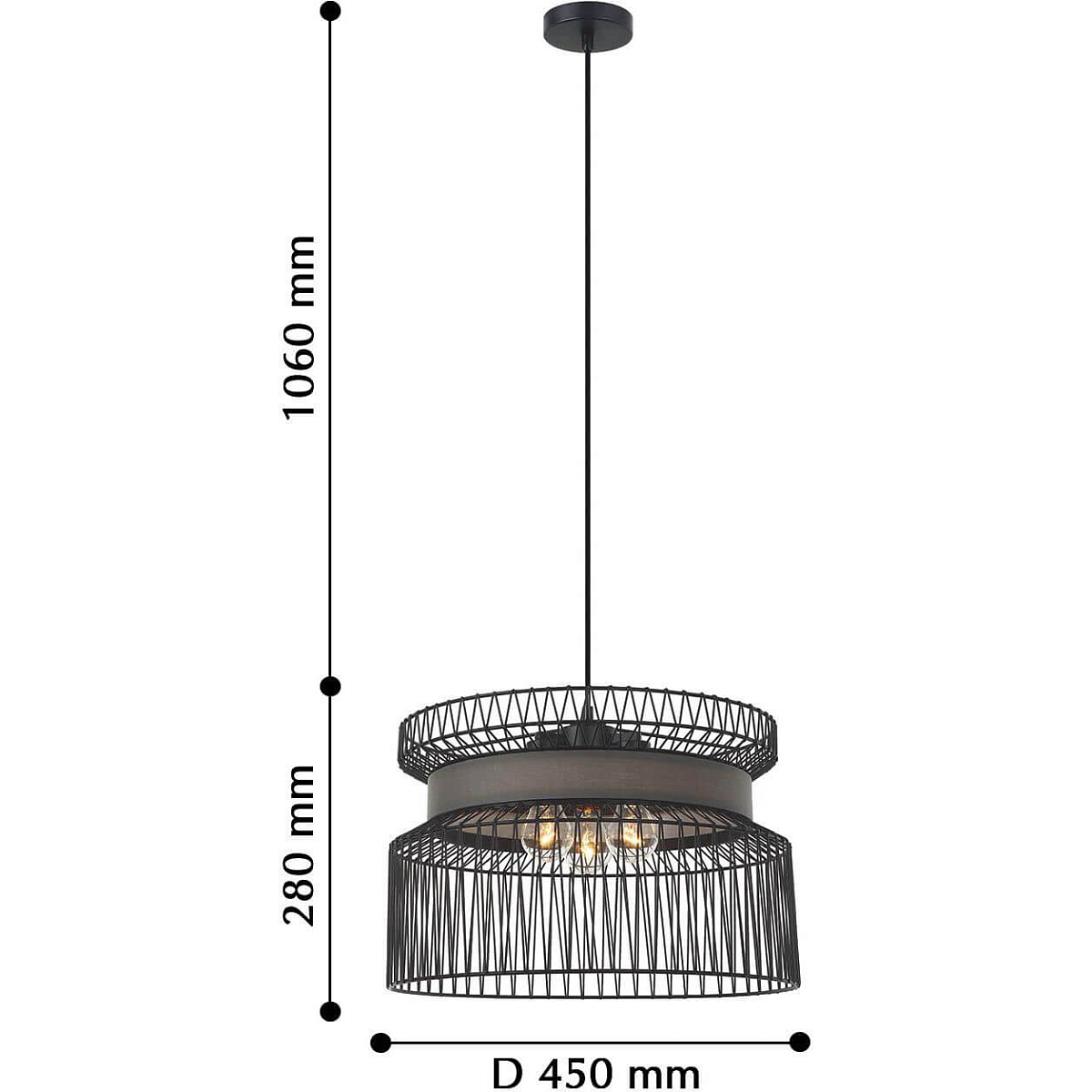 Диаметр 450 мм, высота 280 мм. Монтаж на потолок, подвесной тип, совместима с натяжными потолками. Степень защиты IP20.