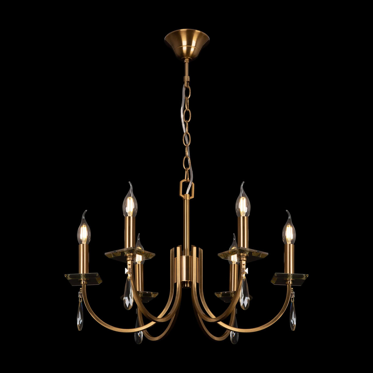 Подвесная люстра Freya Forte FR1006PL-06G создаёт в спальне мягкую атмосферу вечернего салона: шесть свечевидных ламп направлены вверх, свет нежно отражается от потолка и стен, убирая резкие тени. Золотистая металлическая арматура выглядит благородно, без излишней декоративности, линии плавные и стройные. Диаметр 580 мм и высота 598 мм задают гармоничную пропорцию, люстра не перегружает пространство средней комнаты около 12 м².