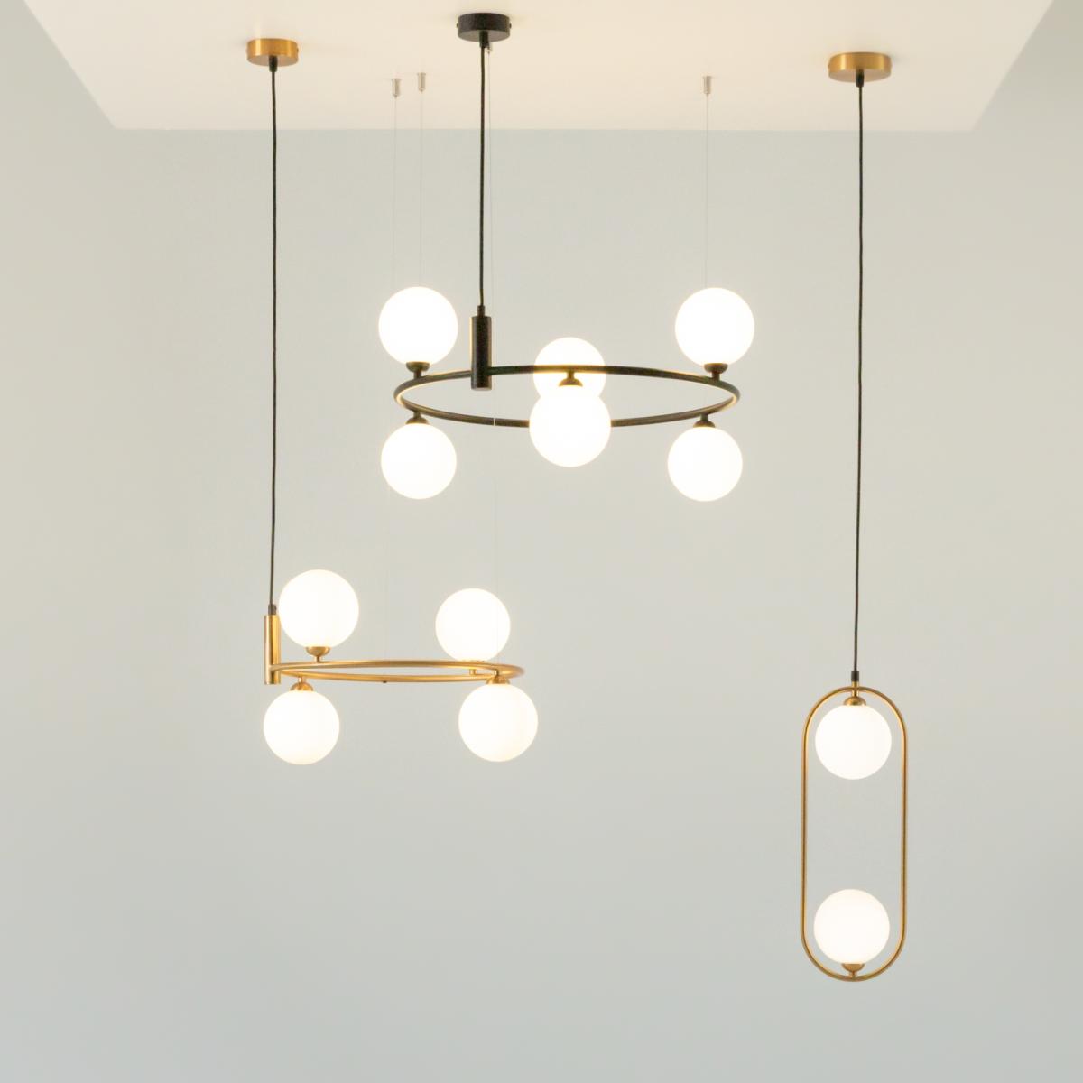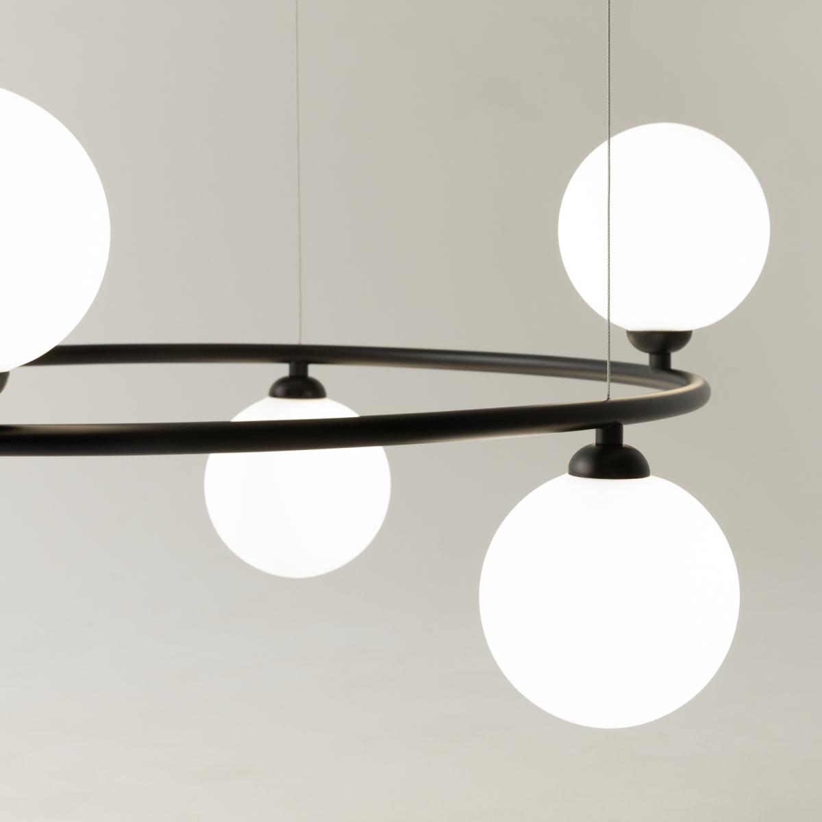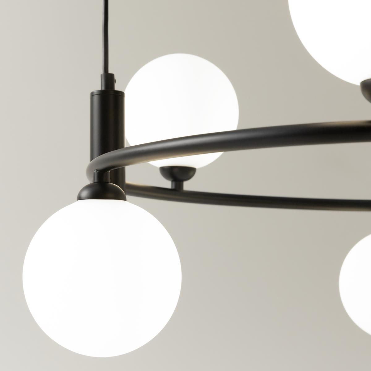 Форма плафонов шар подчеркивает графику кольца, а равные промежутки между ними создают гармонию. Потолочная люстра уверенно впишется в интерьер кухни, особенно над столом или рабочей поверхностью. Освещение получается объемным и живым, без жестких теней. Управление обычным настенным выключателем, при использовании диммируемых ламп подключается регулятор яркости. Конструкция рассчитана на монтаж к стандартным потолочным выводам, плафоны легко снимаются для ухода. Стильно.