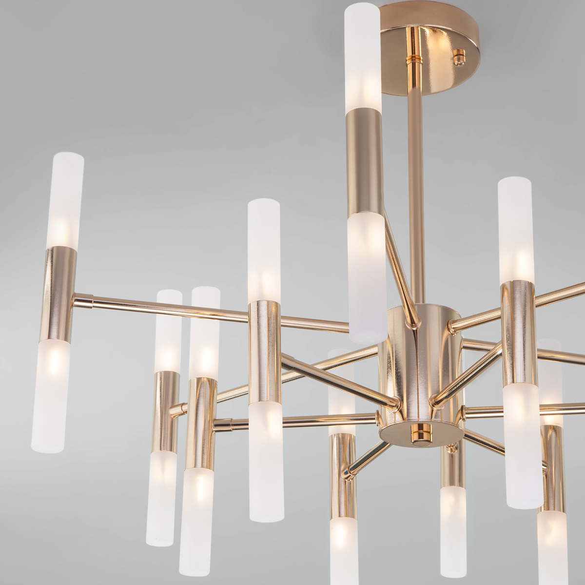 Форма плафона цилиндр подчеркивает графику коллекции, 24 одинаковых элемента создают ровный ритм. Модель смотрится уместно в современной гостиной, поддержит минималистичный интерьер и классические сочетания с древесными поверхностями. Установка на потолок проходит без лишних сложностей, обслуживание простое, акрил легко очищается мягкой салфеткой. Идея понятна с первого взгляда, а свет комфортный каждый день. Стиль современный, цвет арматуры золото.