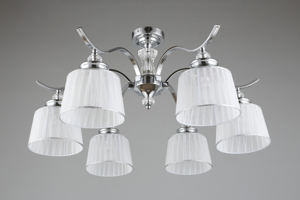 Хромированная арматура сочетается с белыми стеклянными плафонами конусной формы. Плафоны направлены вниз, световой поток 2520 лм даёт комфортное освещение зоны отдыха. Диаметр 800 мм и высота 420 мм подходят для комнат среднего размера. Конструкция рассчитана на 6 ламп с цоколем E14 по 40 Вт, суммарная мощность 240 Вт. Степень защиты IP20 соответствует сухим помещениям.