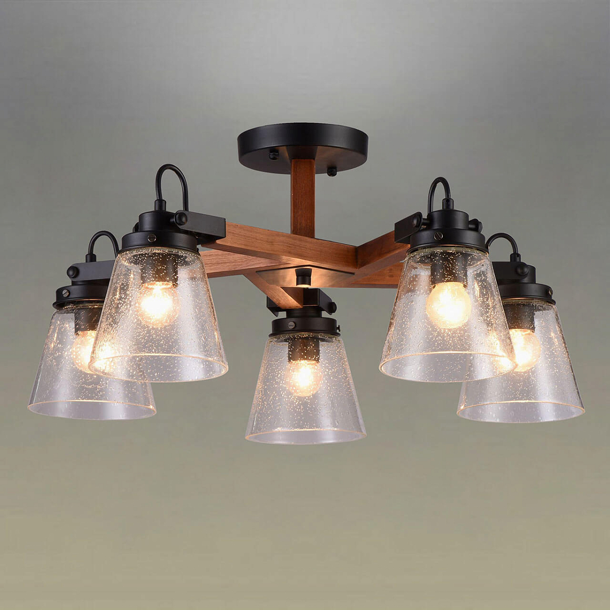 Пять конусных плафонов из прозрачного стекла на прочной черной арматуре подчеркивают стиль кантри. Поворотные крепления плафонов помогают направить свет в нужные зоны.