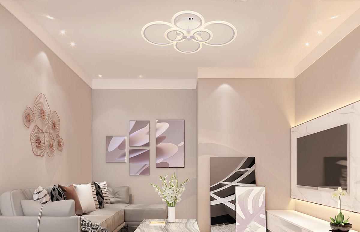 Шесть аккуратных акриловых колец на белой металлической арматуре формируют легкую композицию. Плафоны направлены вниз, свет мягко распределяется по комнате без ослепления. Габариты 780 на 585 мм, высота всего 130 мм, модель уверенно встает под низкий потолок и подходит для натяжных конструкций.