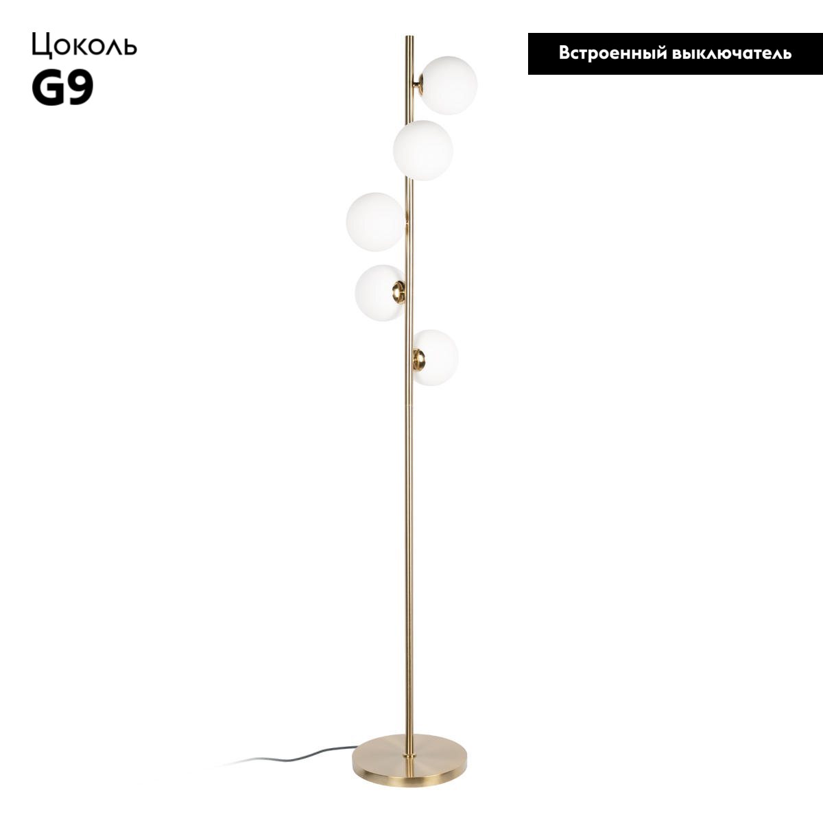 Торшер Loft IT Tely 10236F, напольный светильник высотой 1500 мм с пятью белыми стеклянными шарами. Золотая металлическая арматура подчеркивает теплый характер света, стиль модерн органично смотрится в гостиной.